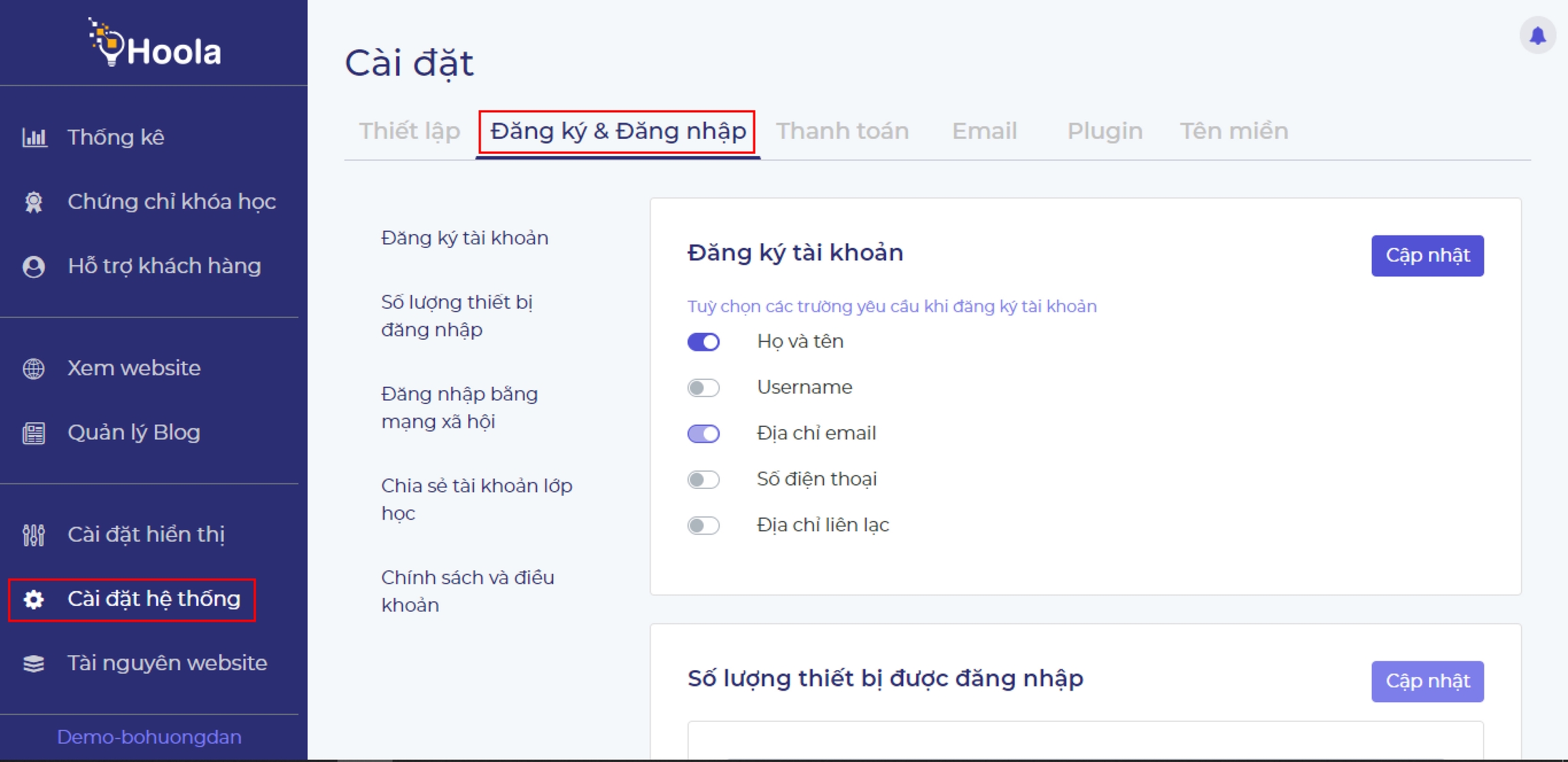 Hướng dẫn thiết lập các thuộc tính đăng ký/ đăng nhập của học viên/ khách hàng/ nhân viên... vào website