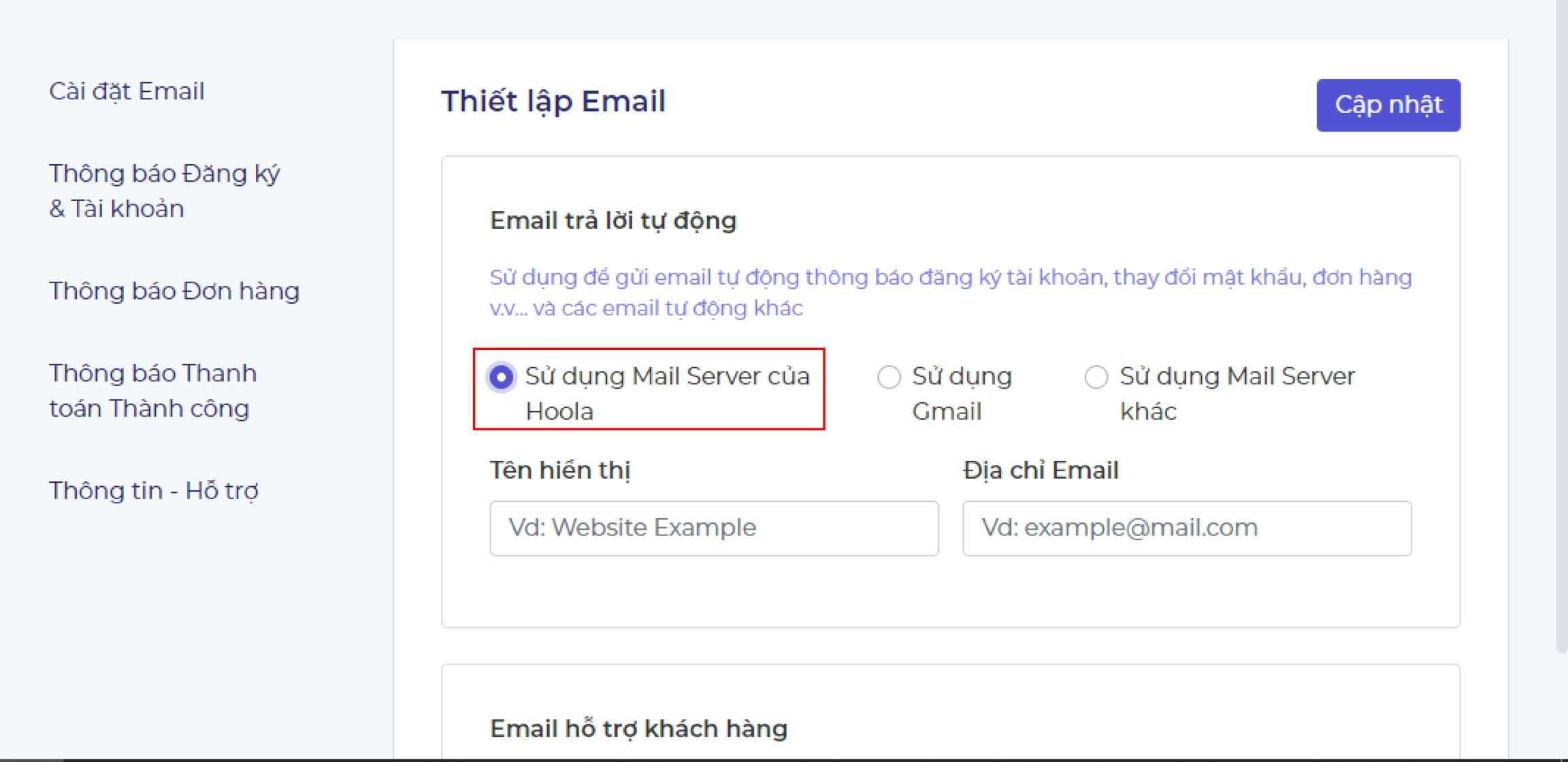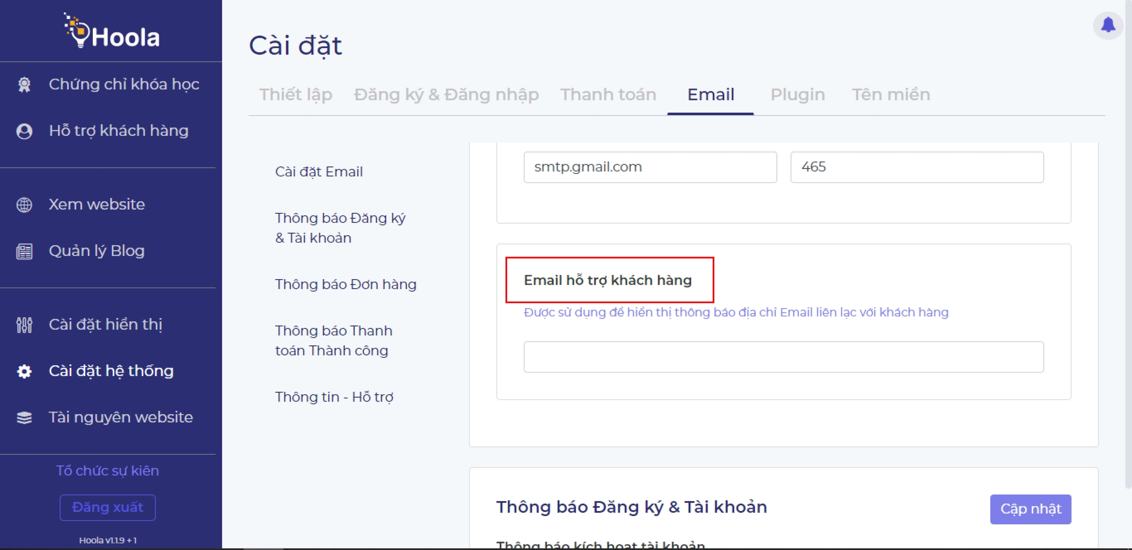 Nếu muốn nhận email phản hồi của học viên qua tài khoản khác, quản trị gõ thông tin vào ô Email hỗ trợ khách hàng