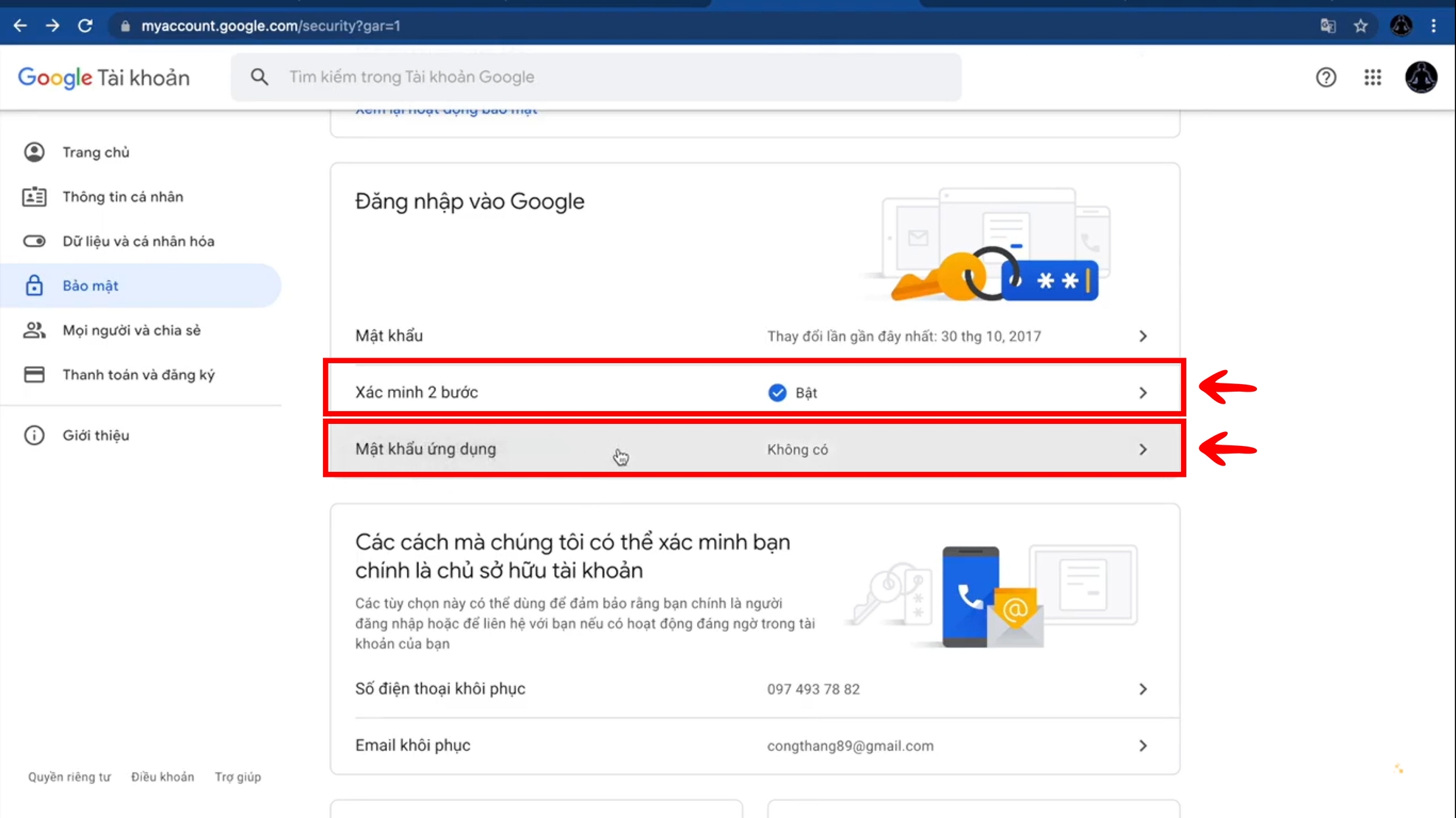 Thông thường các tài khoản sẽ hiện như trên và quản trị sẽ tiếng hành Bật ở Xác minh hai bước. Sau đó xuống Mật khẩu ứng dụng để tiến hành cài đặt.