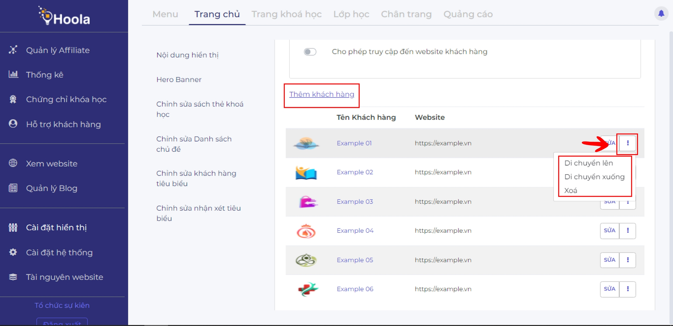 Nếu muốn xóa khách hàng, thêm khách hàng hoặc di chuyển phần hiện thị trước sau, quản trị viên tham khảo hình ảnh sau: