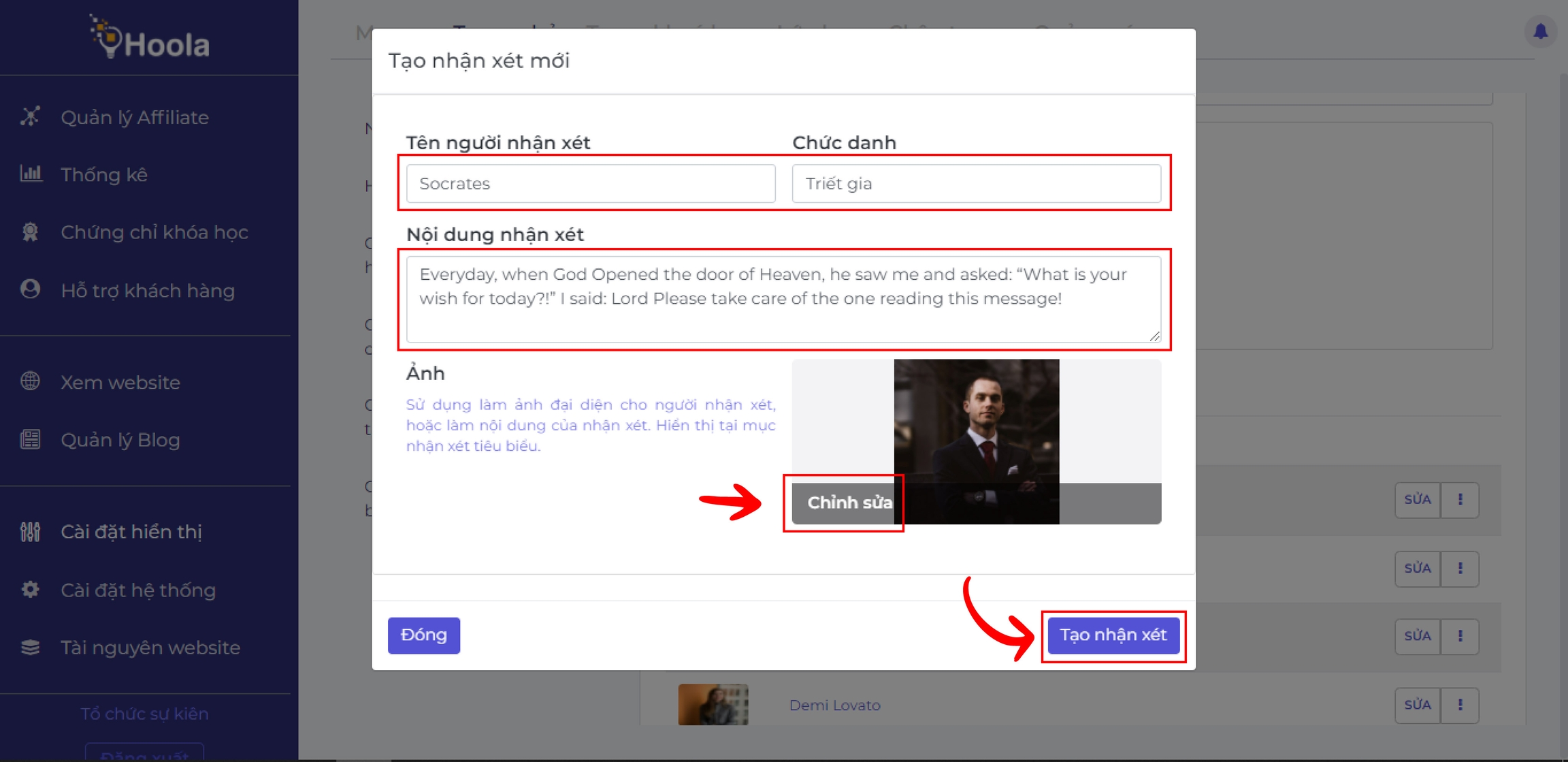 Để thay đổi nội dung từng lời nhận xét, nhấn vào phần Sửa.