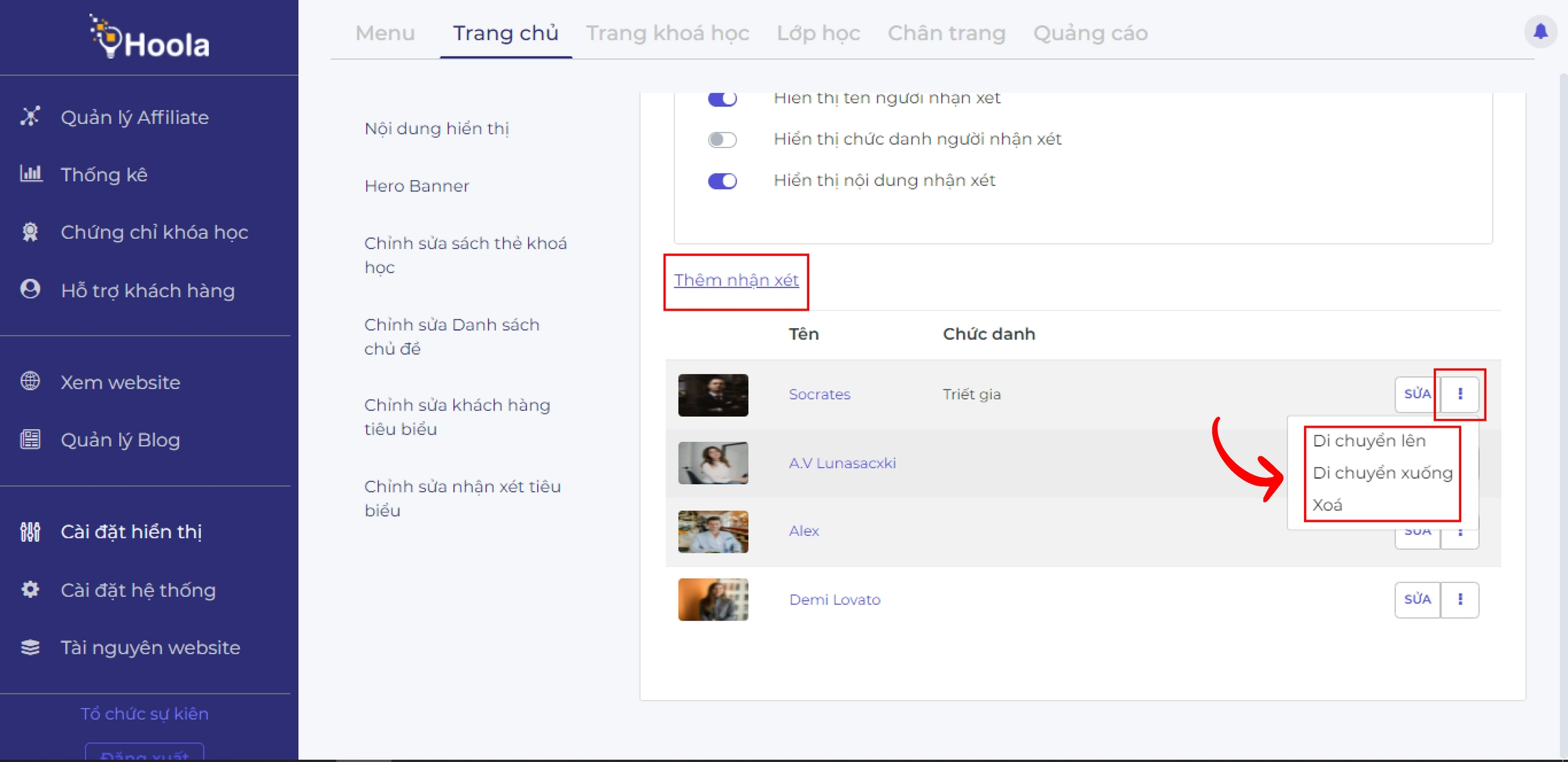 Nếu muốn xóa nhạn xét, thêm nhận xéthoặc di chuyển phần hiện thị trước sau, quản trị viên tham khảo hình ảnh sau: