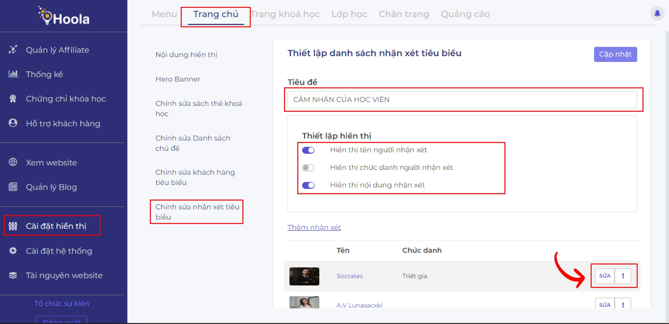 Vào Cài đặt hiện thịTrang chủChỉnh sửa nhận xét tiêu biểu