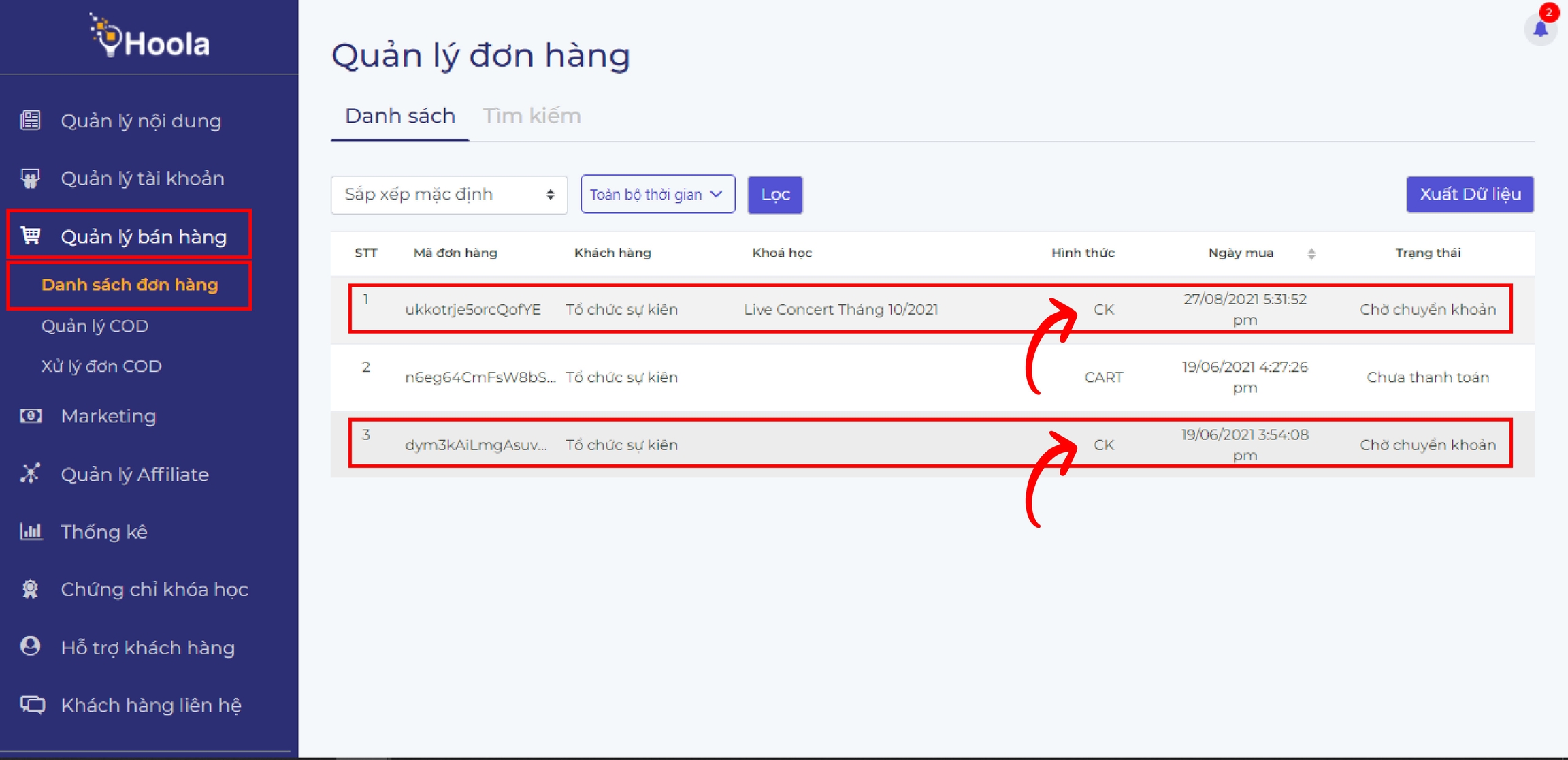 Quản trị chọn những đơn có hình thức "CK" và nhấn vào đơn hàng cần tìm.