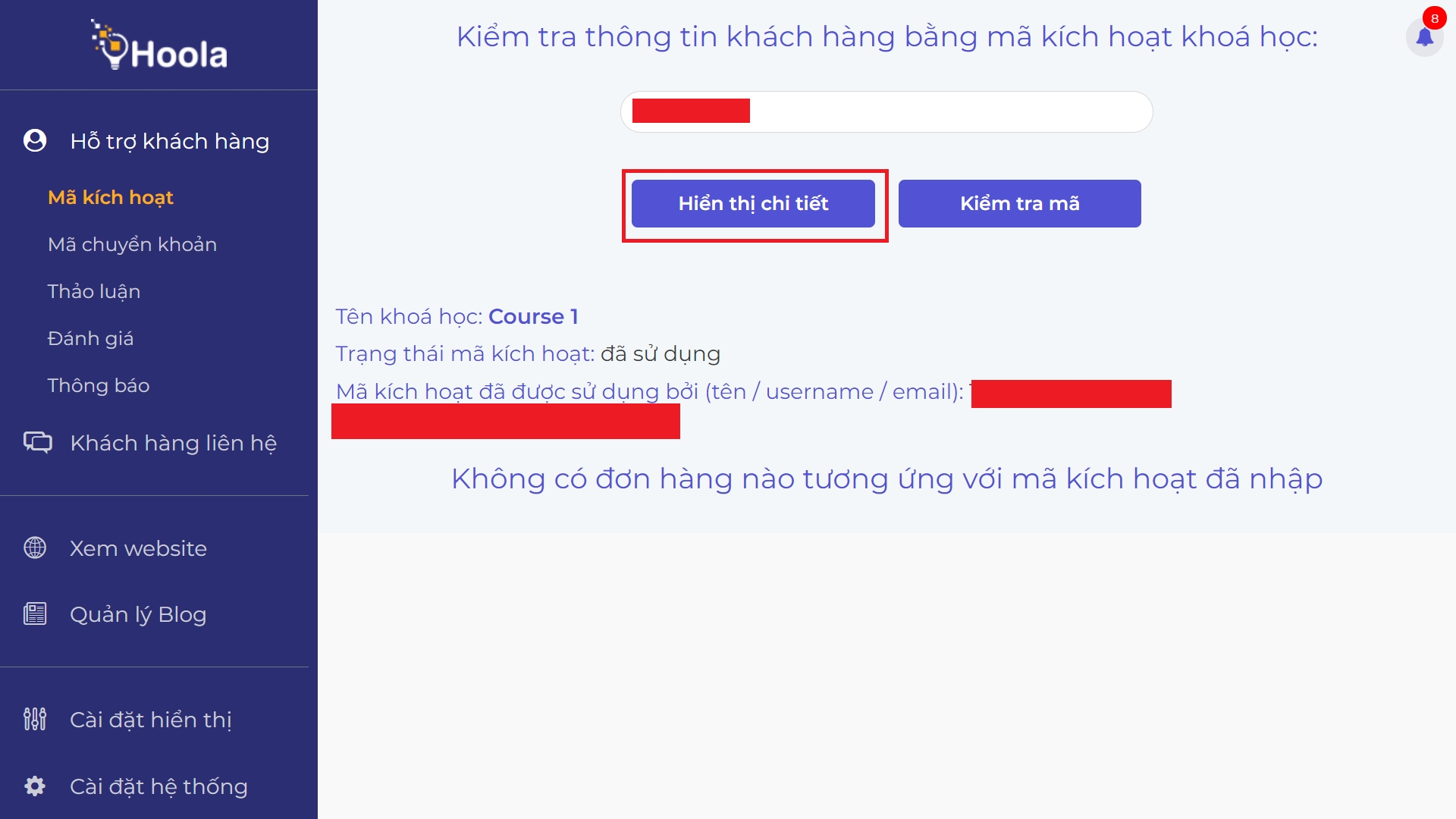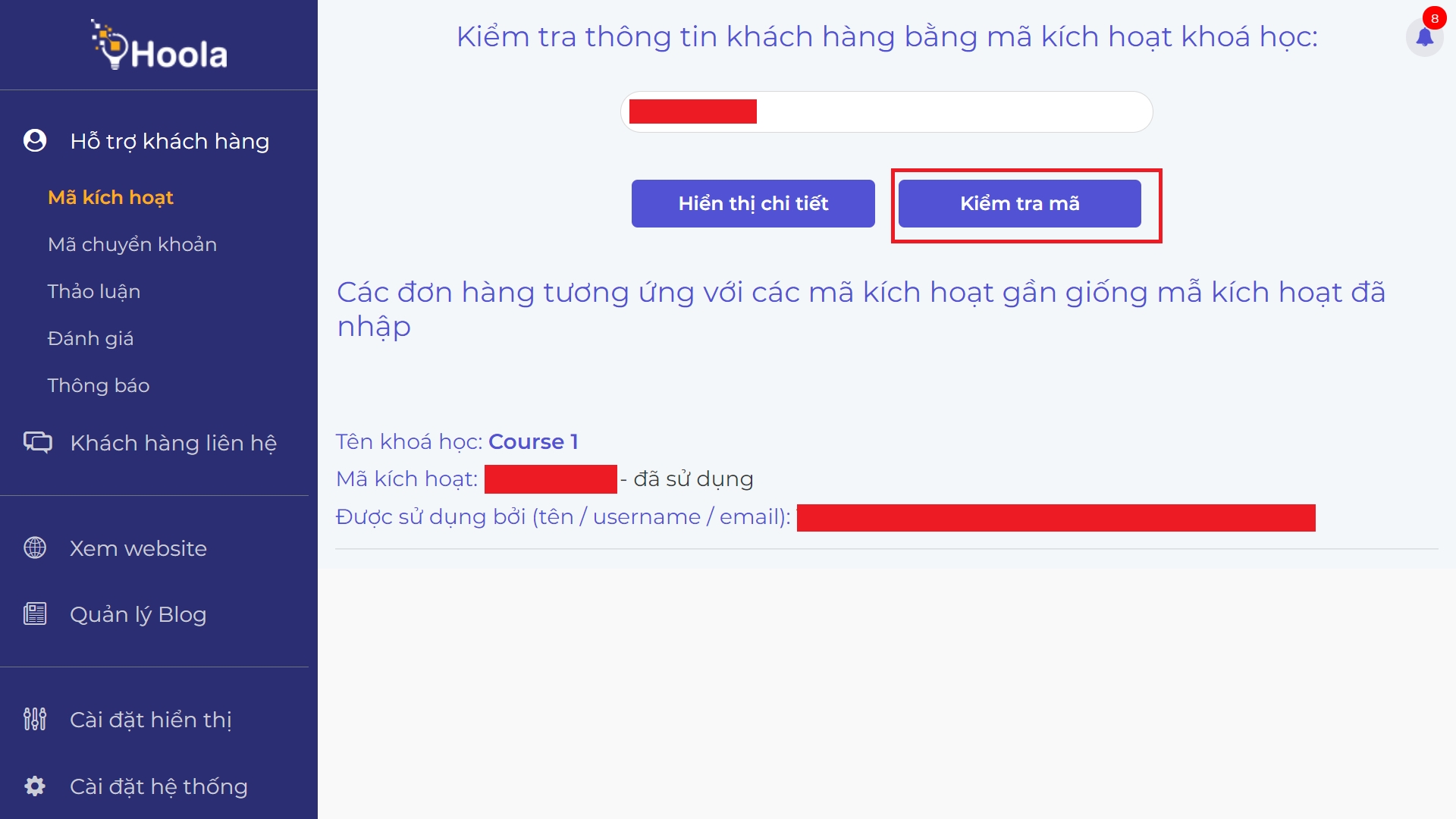 Nếu học viên gặp khó khăn trong việc kích hoạt khóa học bằng Mã kích hoạt, quản trị viên có thể xem chi tiết về mã kích hoạt hoặc kiểm tra mã qua Hỗ trợ khách hàng Mã kích hoạt.
