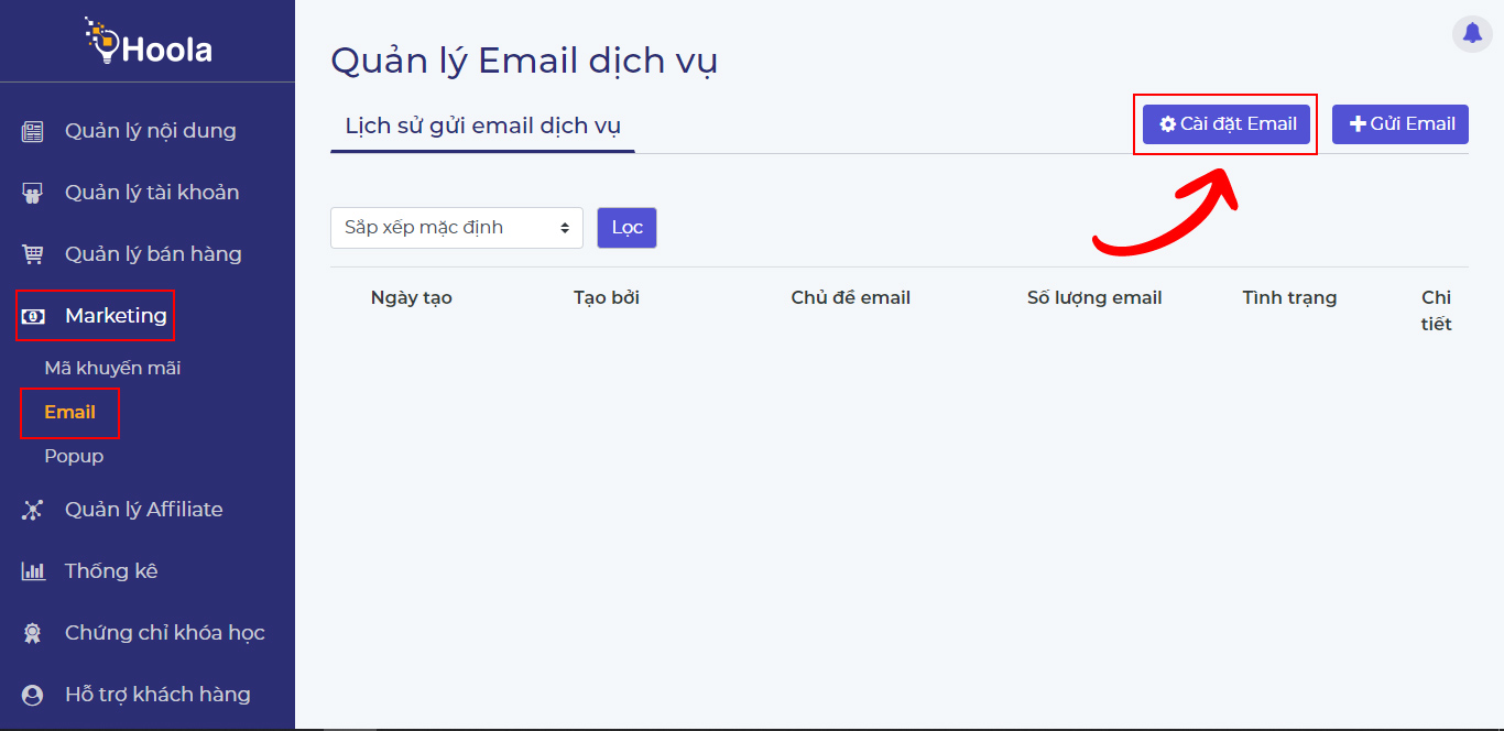 Hướng dẫn cài đặt Email hệ thốngCũng tương tự Email Hệ thống, quản trị viên vào MarketingEmail Cài đặt Email và cài đặt các thông tin tương tự như khi cài đặt Email hệ thống.