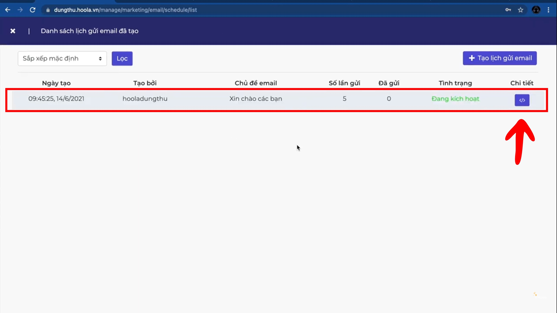 Hệ thống sẽ hiện lại Danh sách lịch gửi Email đã tạo bao gồm Tình trạng của chiến dịch, để xem chi tiết quản trị nhấn vào biểu tượng ở cuối.