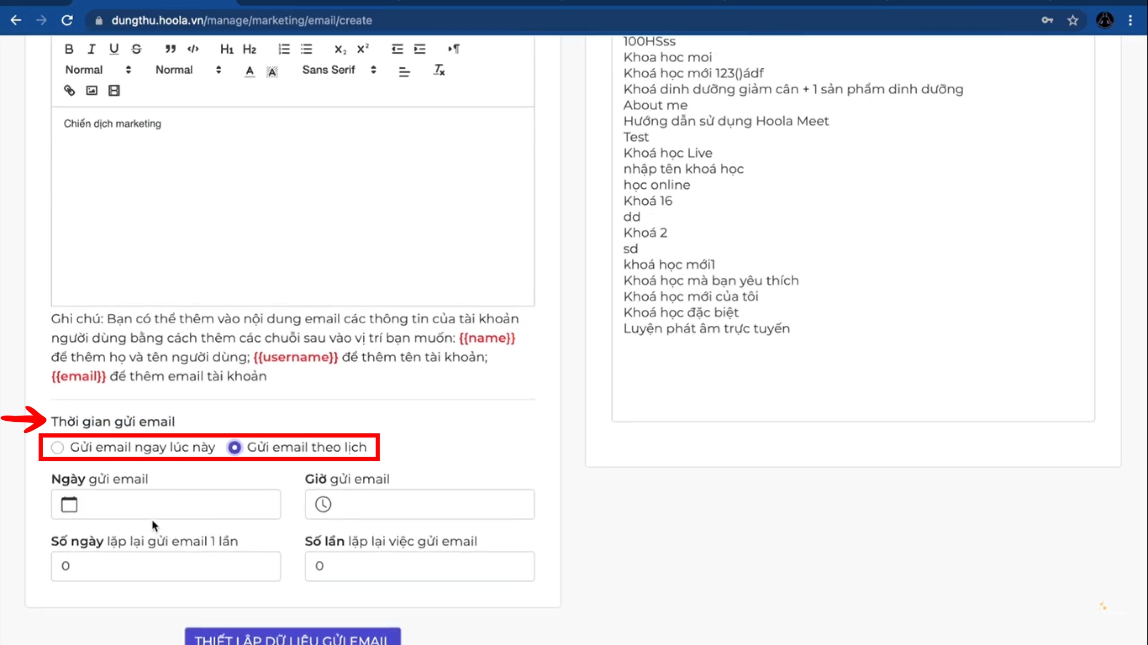 Sau khi đã soạn thảo Email (quản trọ viên nên thêm các thông tin như {{name}}, {{username}} hay {{email}} để tăng độ tin tưởng)chọn đối tượng và thời gian gửi mail, quản trị viên có thể chọn Gửi Email ngay lúc này hoặc Gửi Email theo lịch