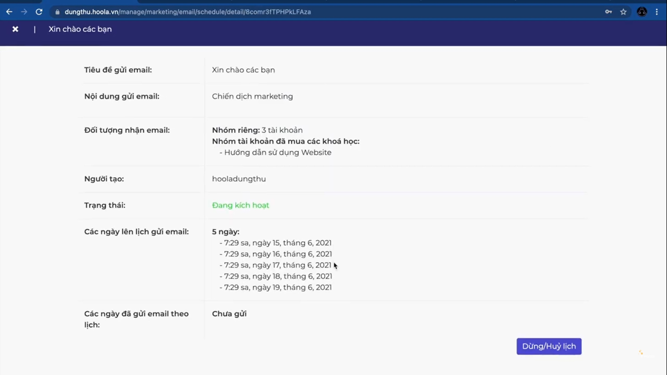 Ở đây quản trị viên có thể Dừng hoặc Hủy lịch của chiến dịch email nếu muốn.