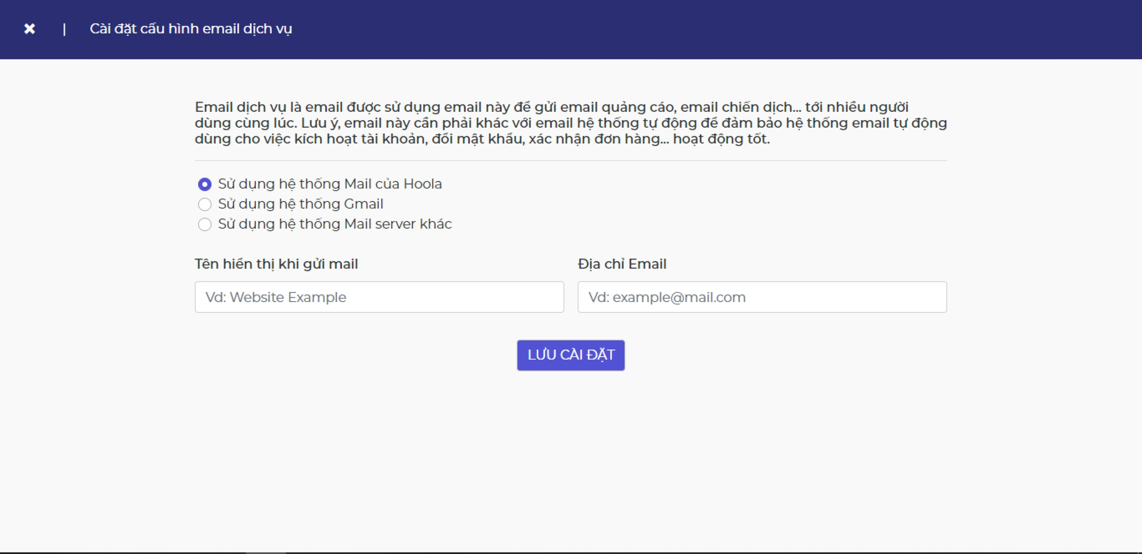 Phần cài đặt tuy tương tự nhưng khuyến cái quản trị viên nên sử dụng Email chăm sóc riêng và Email có độ tin cậy cao.