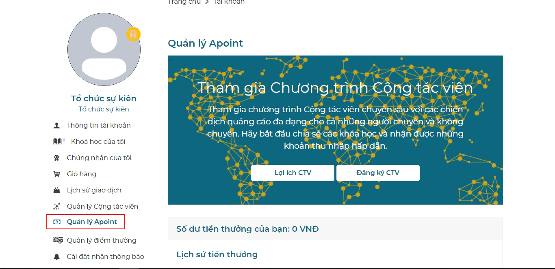 Trong phần Quản lý Apoint sẽ có thông tin tổng số tiền được nhận từ việc giới thiệu khóa học thành công cho học viên mới