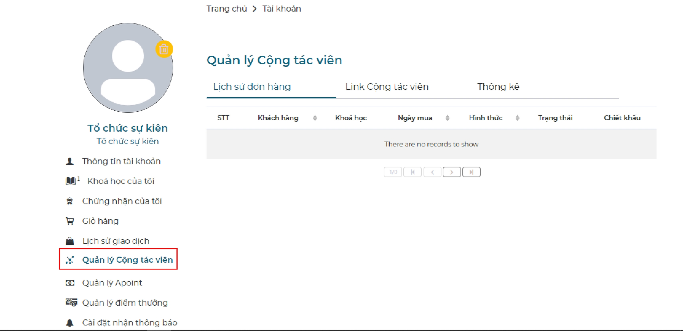 Vào mục Quản lý Cộng tác viên để kiểm tra thông tin của tất cả đơn hàng đơn hàng từ Link Affiliate mà học viên đã gửi đi.