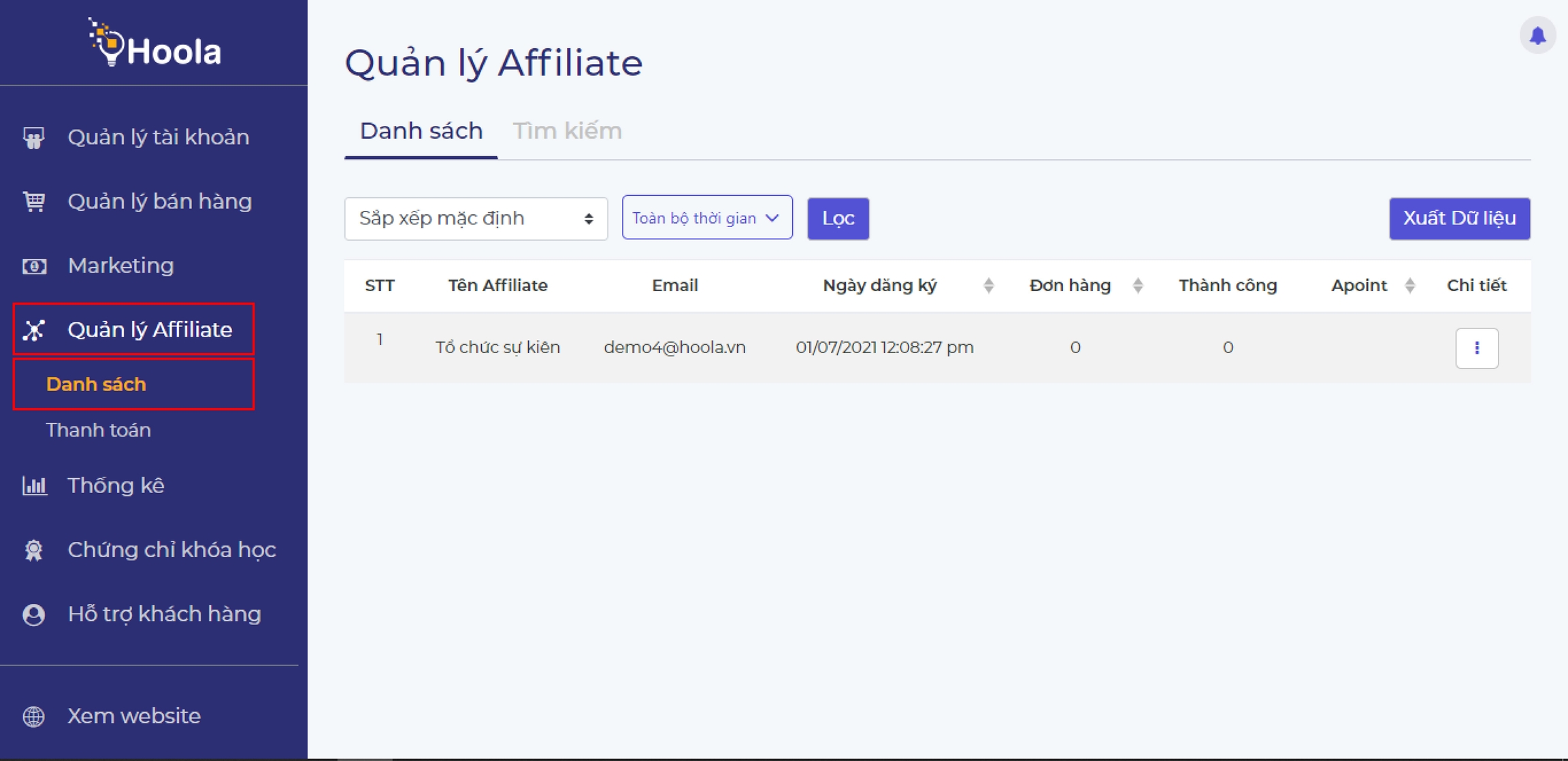 Quản trị viên vào mục Quản lý AffiliateDanh sách để quan sát những học viên đã tham gia mạng lưới công tác viên của web