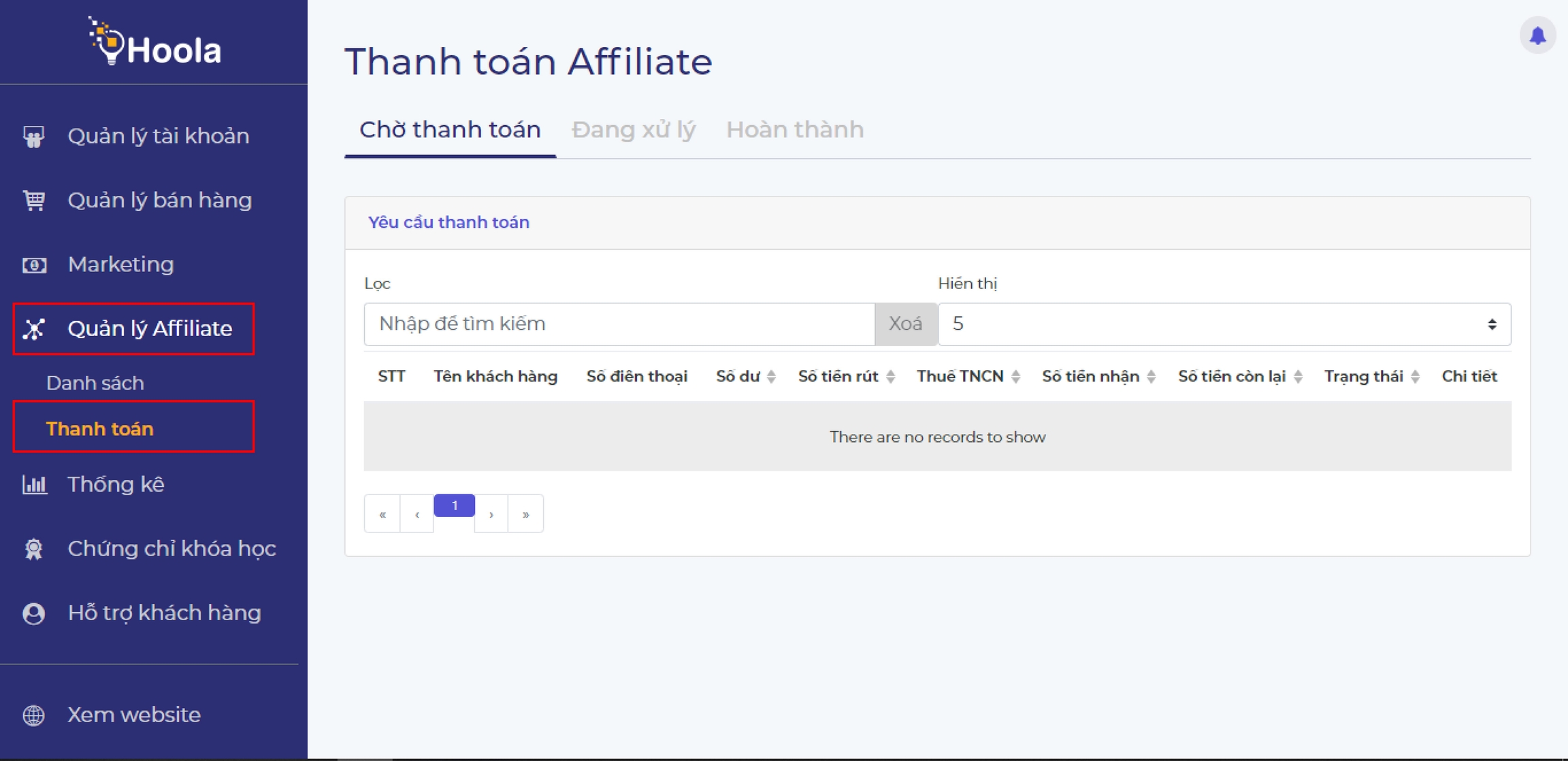 Và nếu có yêu cầu thanh toán tiền thưởng từ học viên, quản trị viên vào mục Quản lý AffiliateThanh toán để xử lý