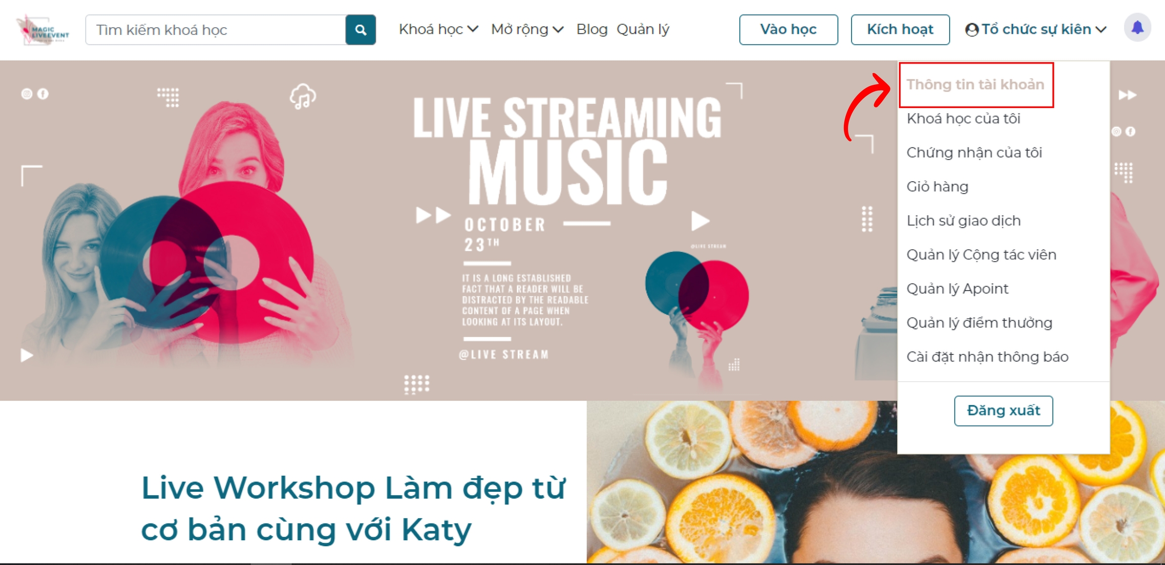 Học viên để kiểm tra đơn hàng đã giới thiệu cho học viên mới, tiến hành vào mục Thông tin tài khoản ở phía gốc phải phần tên của học viên.