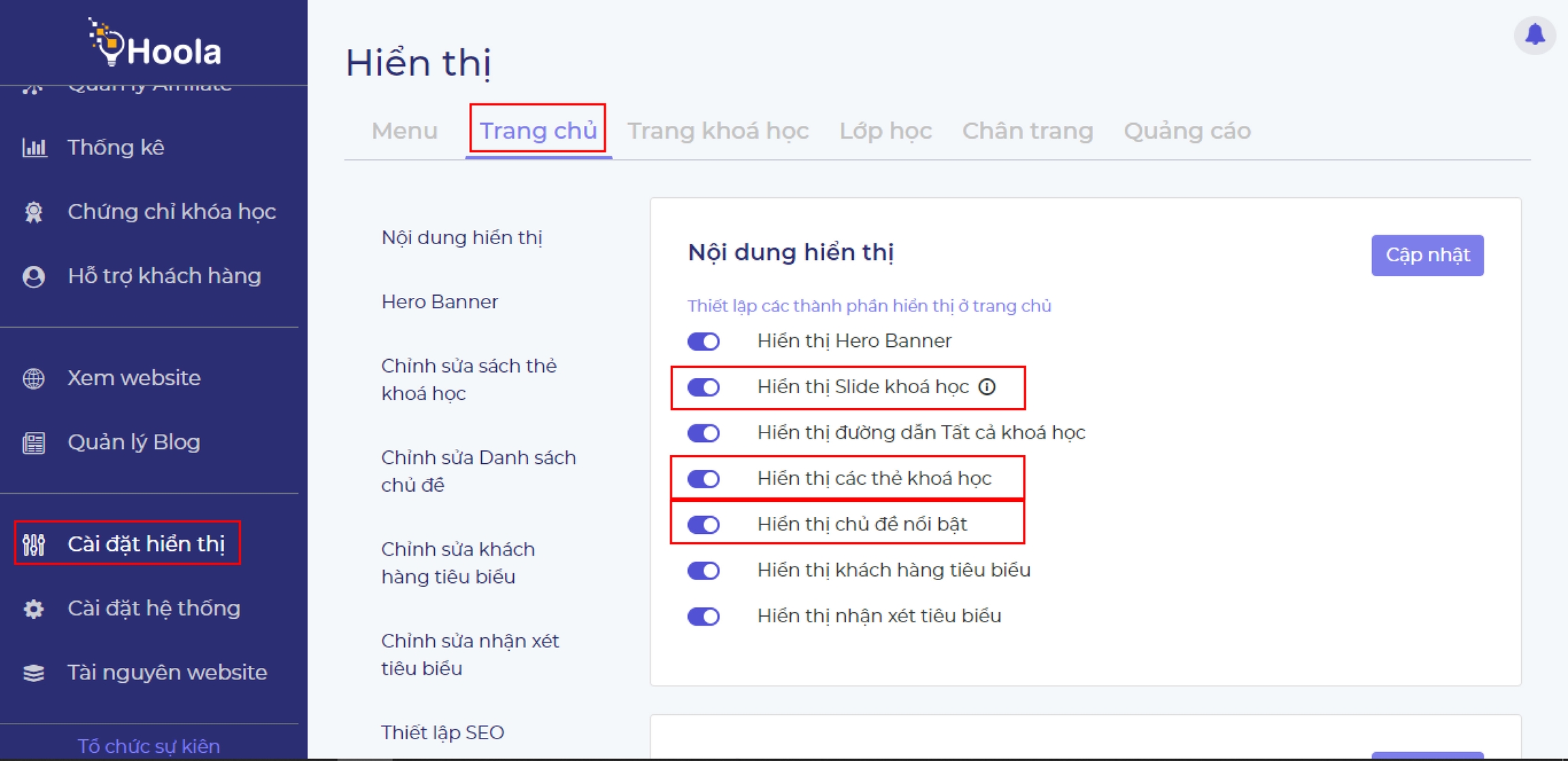 Vì có nhiều khóa chỉ muốn lưu hành nội bộ hoặc khóa cũ, hoặc nhiều mục nằm ở thời gian gian quả khứ, quản trị có thể bật/tắt chế độ hiển thị. Hệ thống mặc định ở dạng ẩn nên quản trị web thực hiện các cách sau để khóa học cũng như chủ đề/ thẻ hiển thị lên web.
