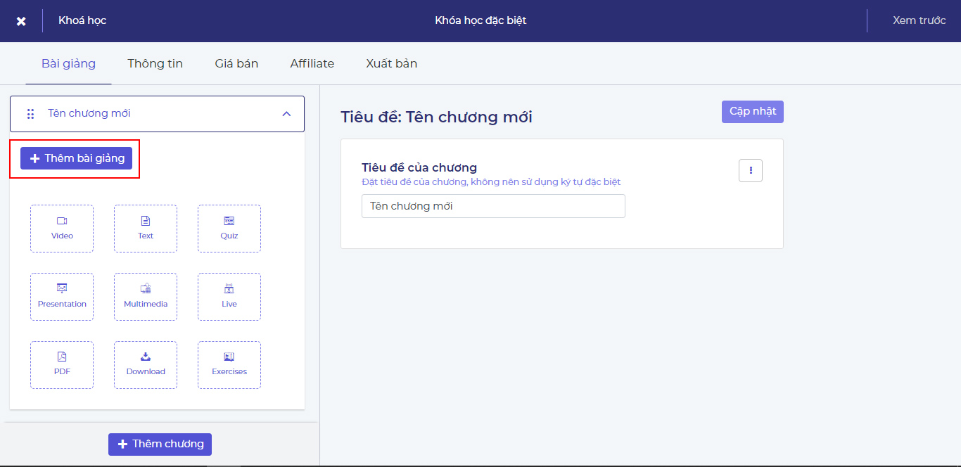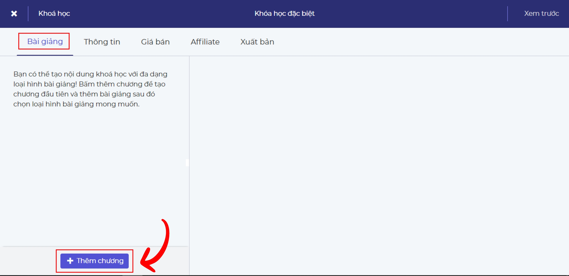 Đây là phần sẽ hiển thị nội dung đào tạo của một khóa học. Nhấn Thêm chương để bắt đầu, trong mỗi chương sẽ có đa dạng loại hình cho khách hàng lựa chọn.