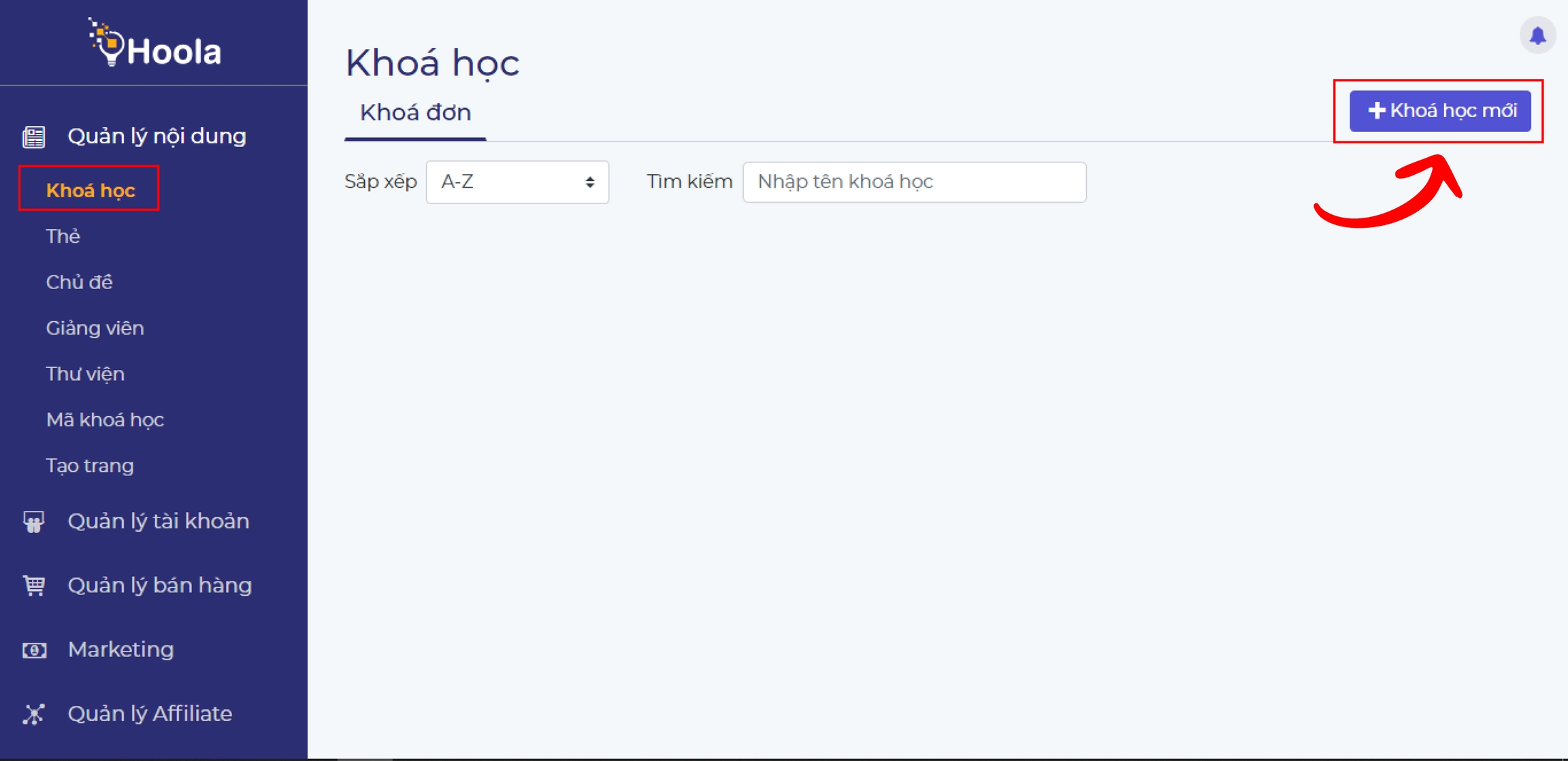 Trước tiên vào Quản lý nội dung, nhấn Khóa học Khóa học mới