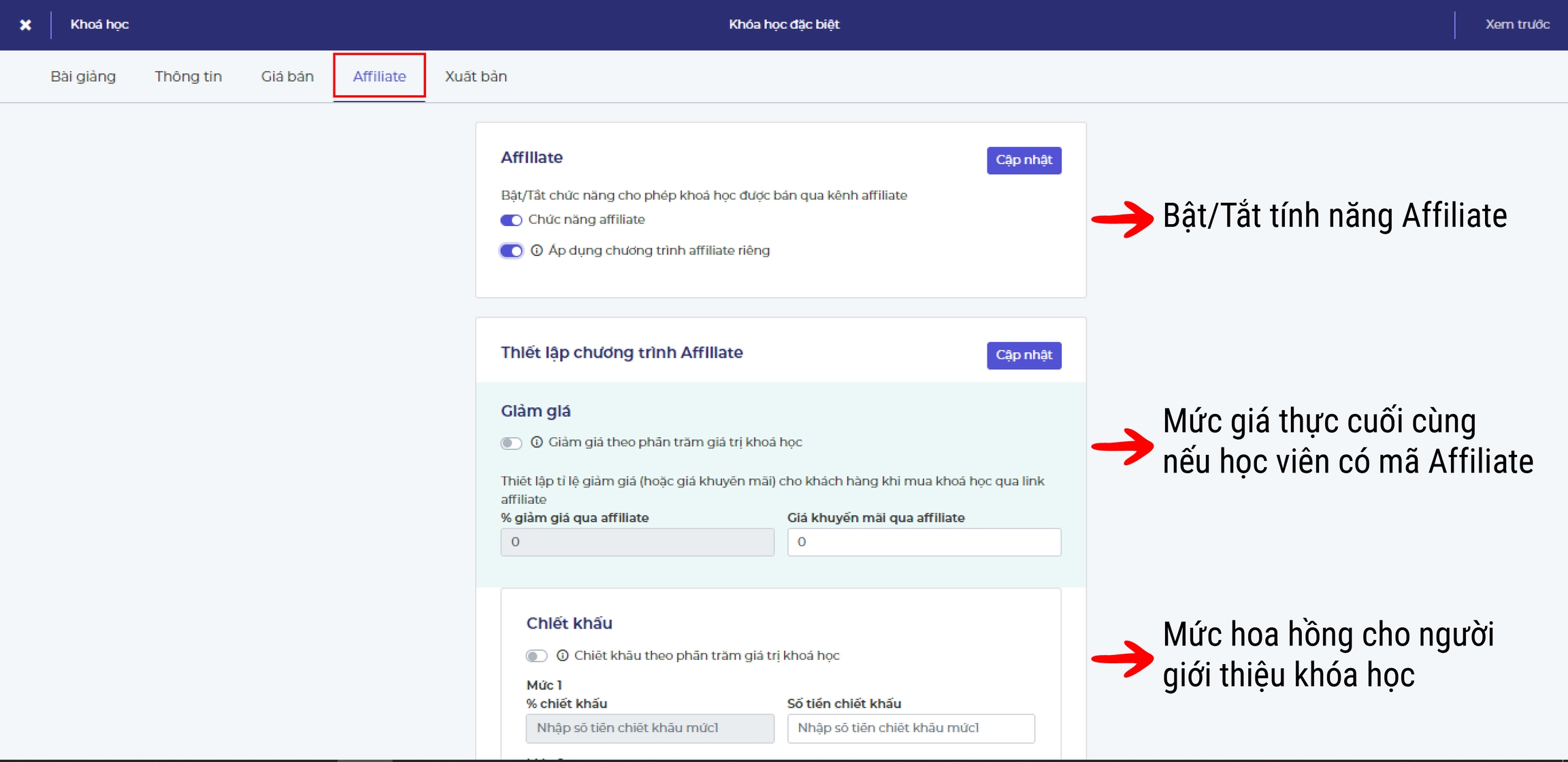 Tính năng mở rộng cộng tác viên, kinh doanh khóa học qua việc giới thiệu, giúp cho học viên có mức học phí tốt hơn, cùng tạo một nguồn thu nhập từ hoa hồng cho người giới thiệu khóa học
