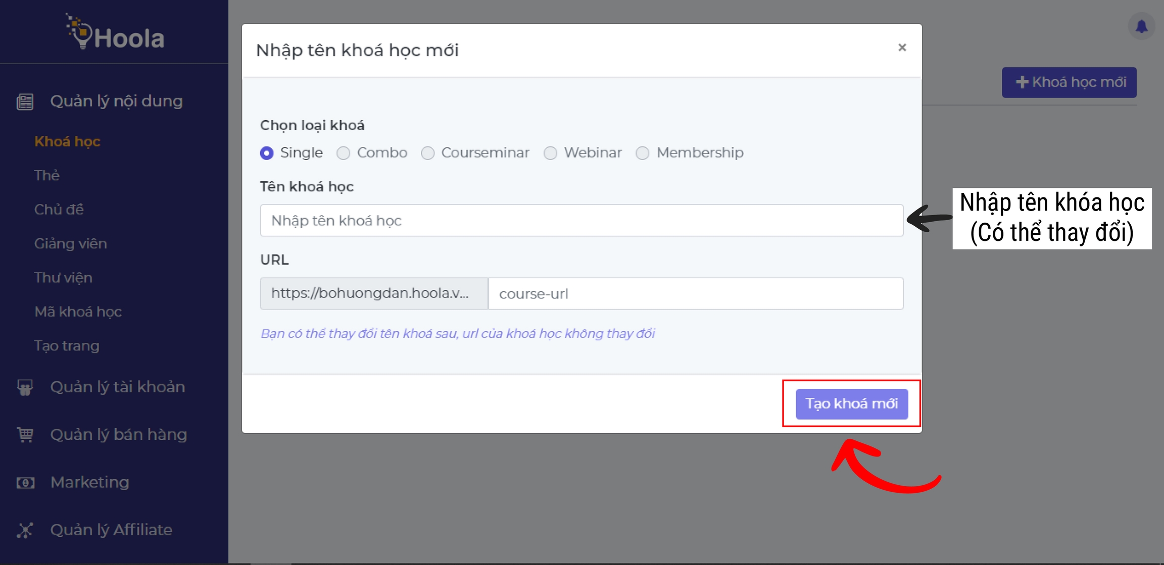 Tên khóa học: chính là tên đã đặt ngay khi tạo khóa mới, khách hàng sẽ thay đổi tên ở đây.