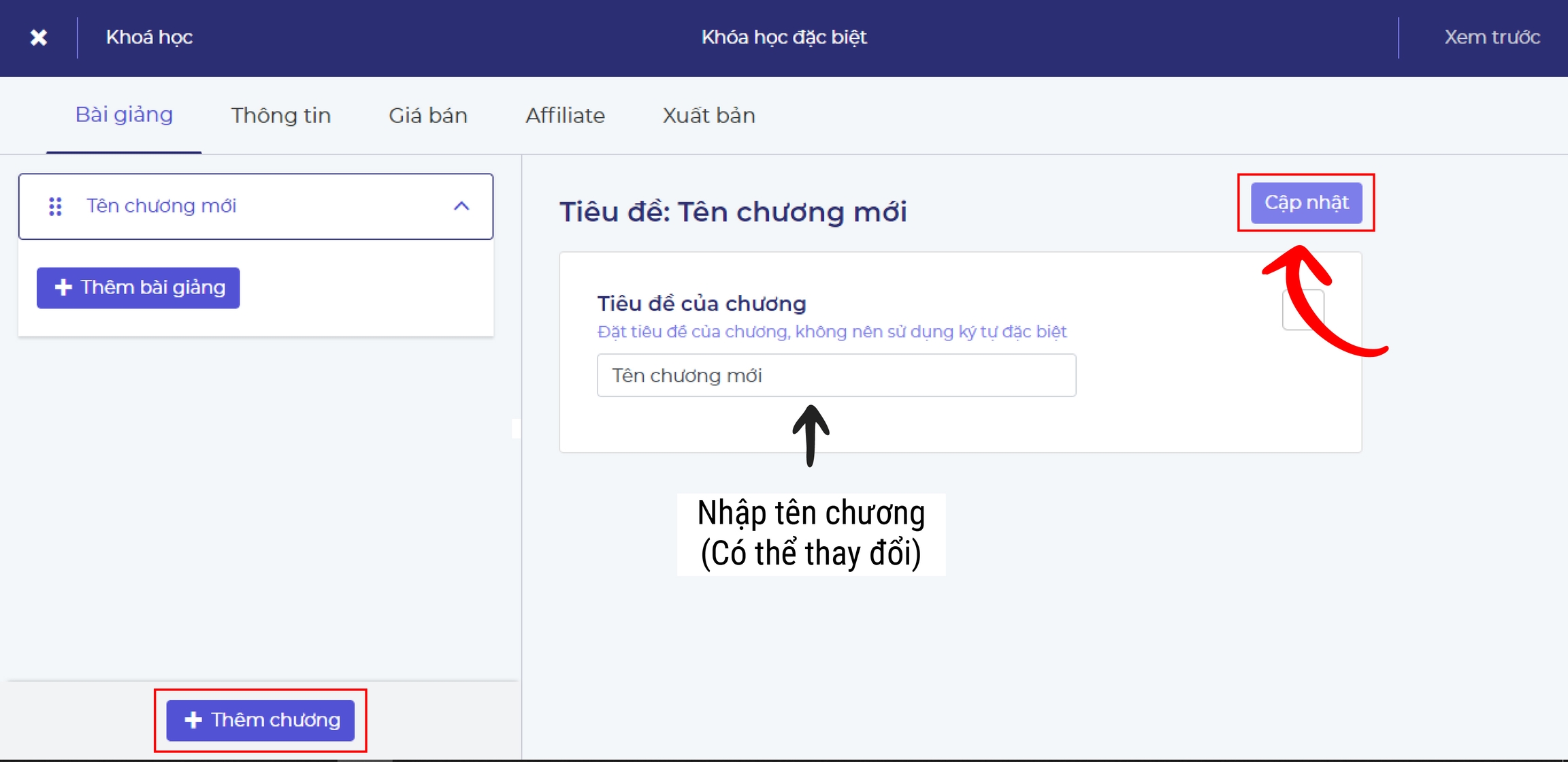 Nhập tên chương vầ nhấn Cập nhập để lưu thông tin