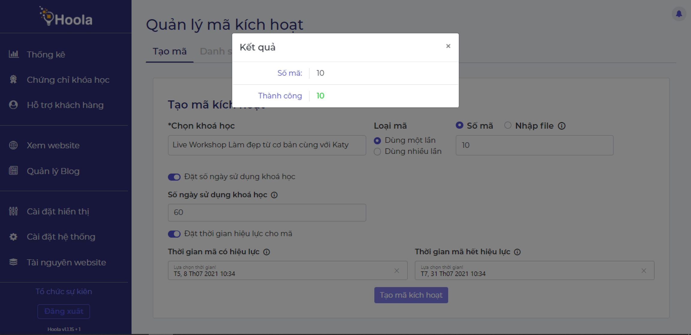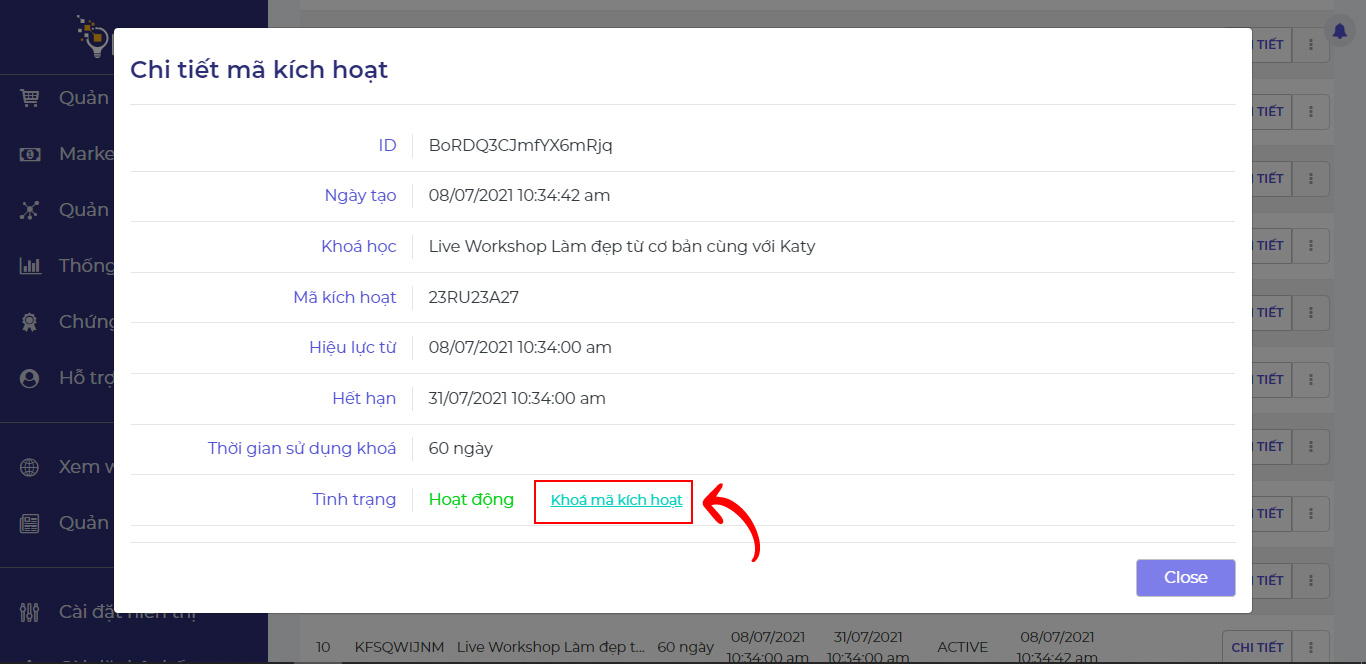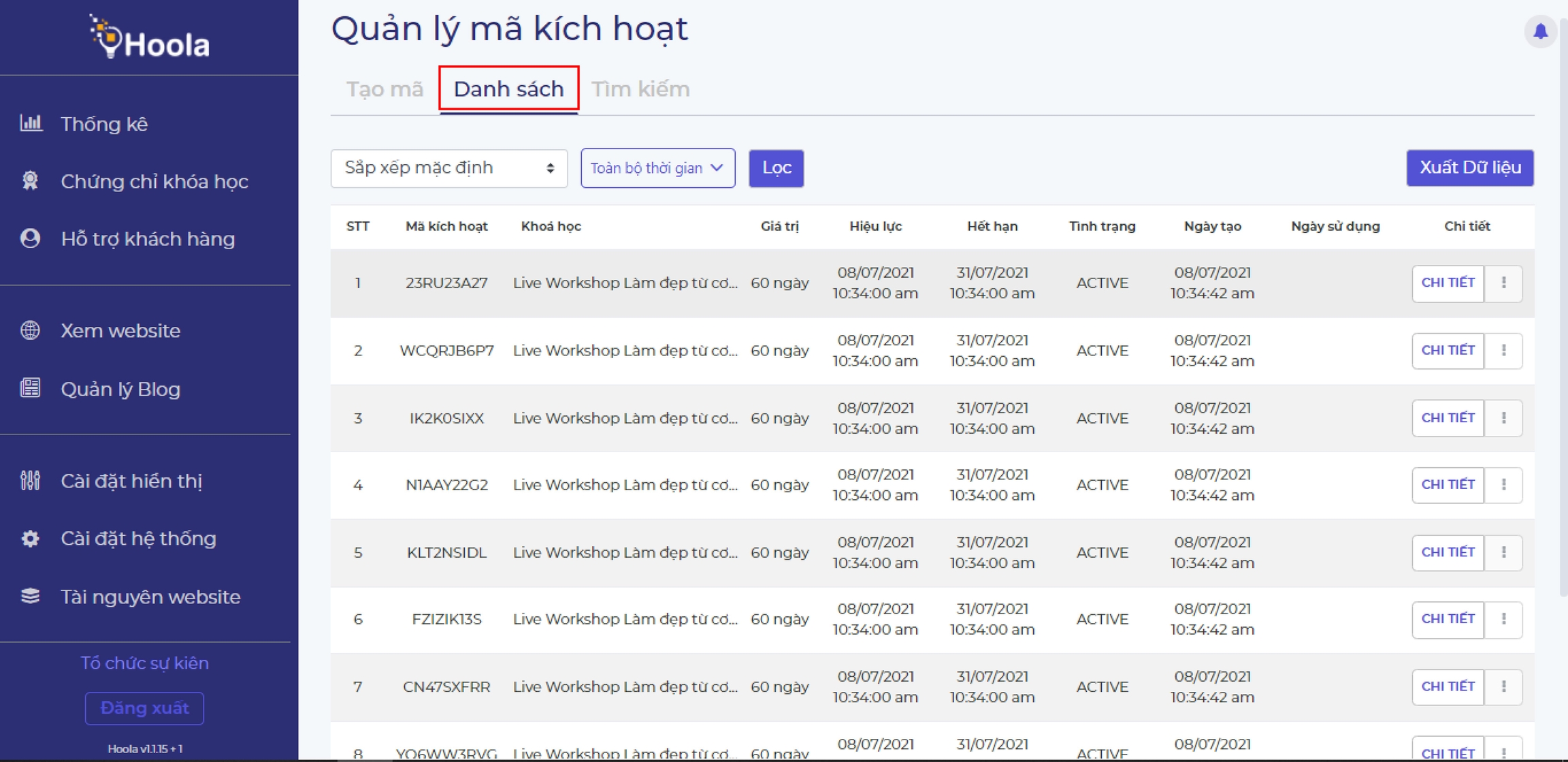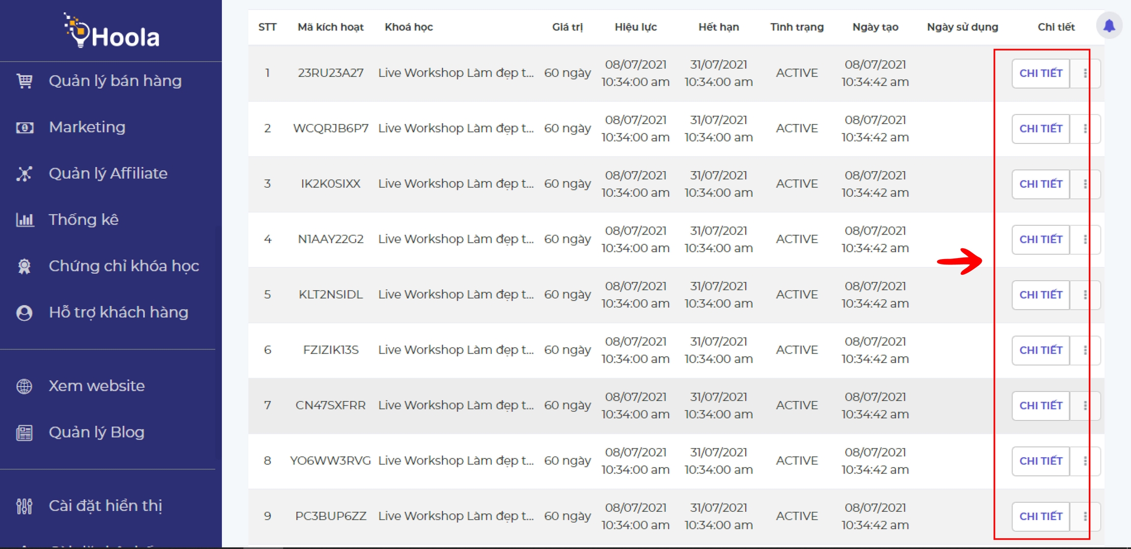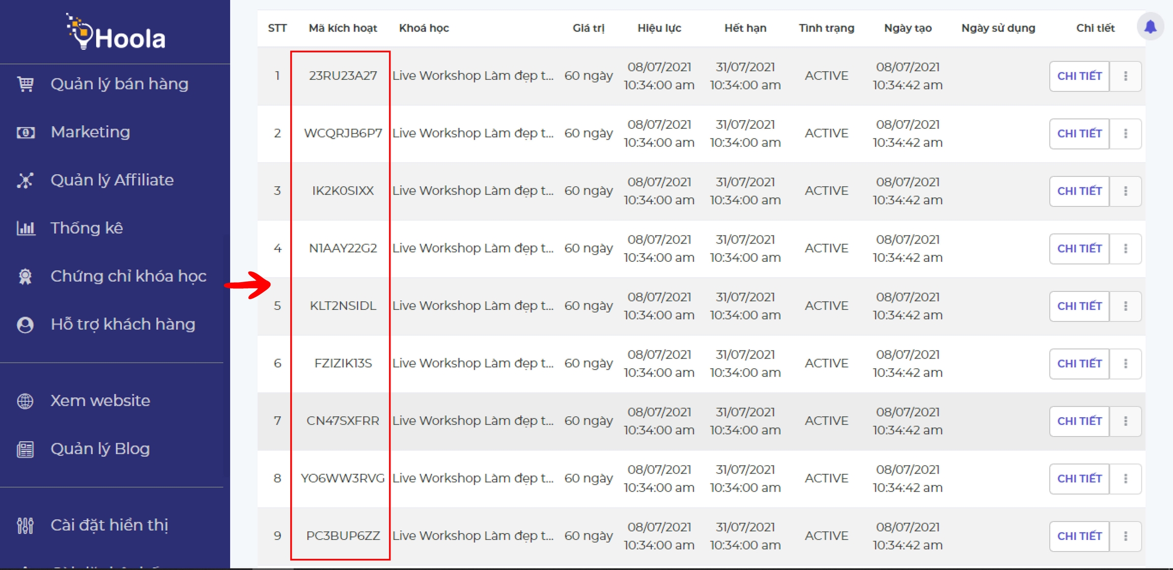 Và để gửi mã này đến cho học viên, quản trị viên chỉ cần copy cột Mã kích hoạt và gửi cho học viên.