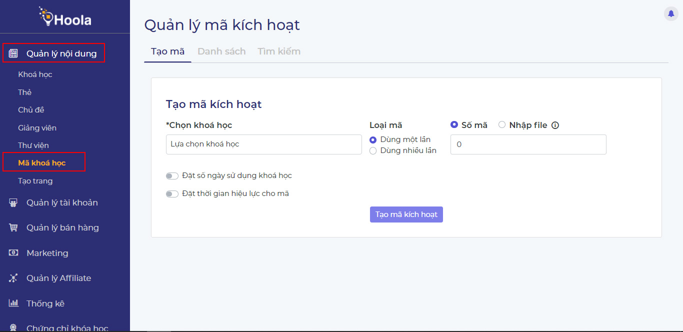 Chọn khóa học: Chọn một khóa mà quản trị viên muốn sinh mã.