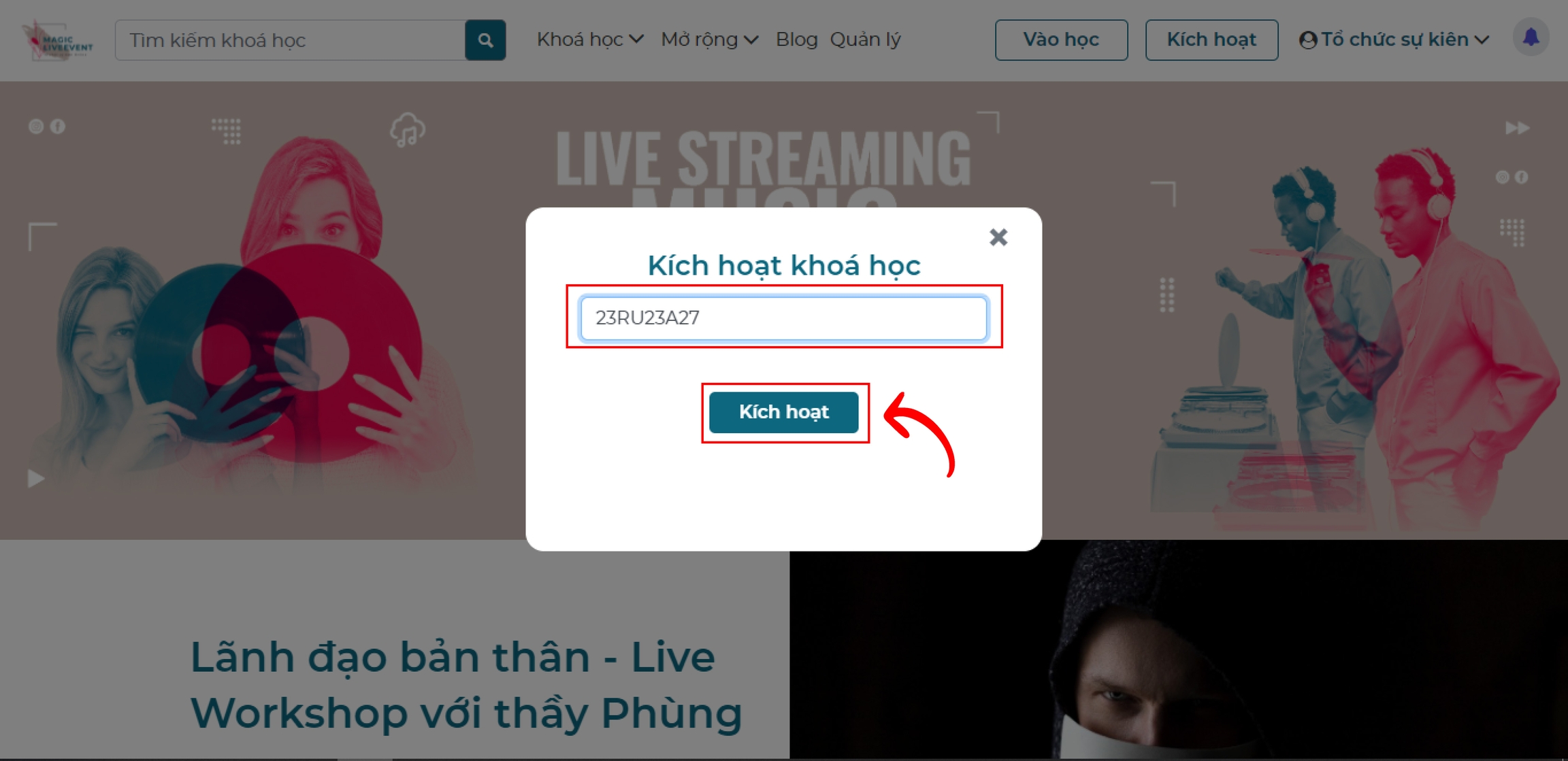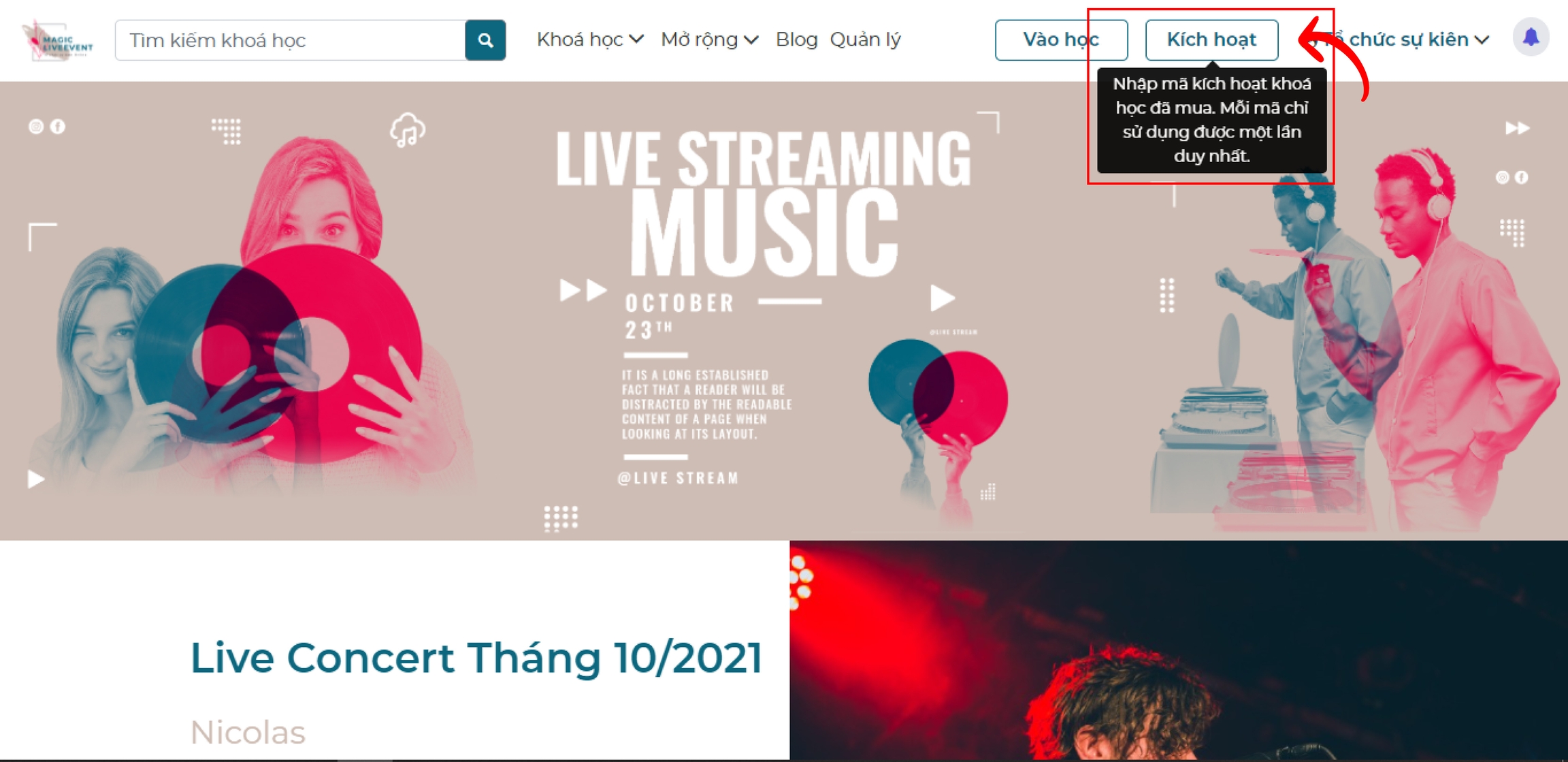 Học viên để sử dụng mã chỉ cần nhấn vào Kích hoạt trên thanh bar của web.