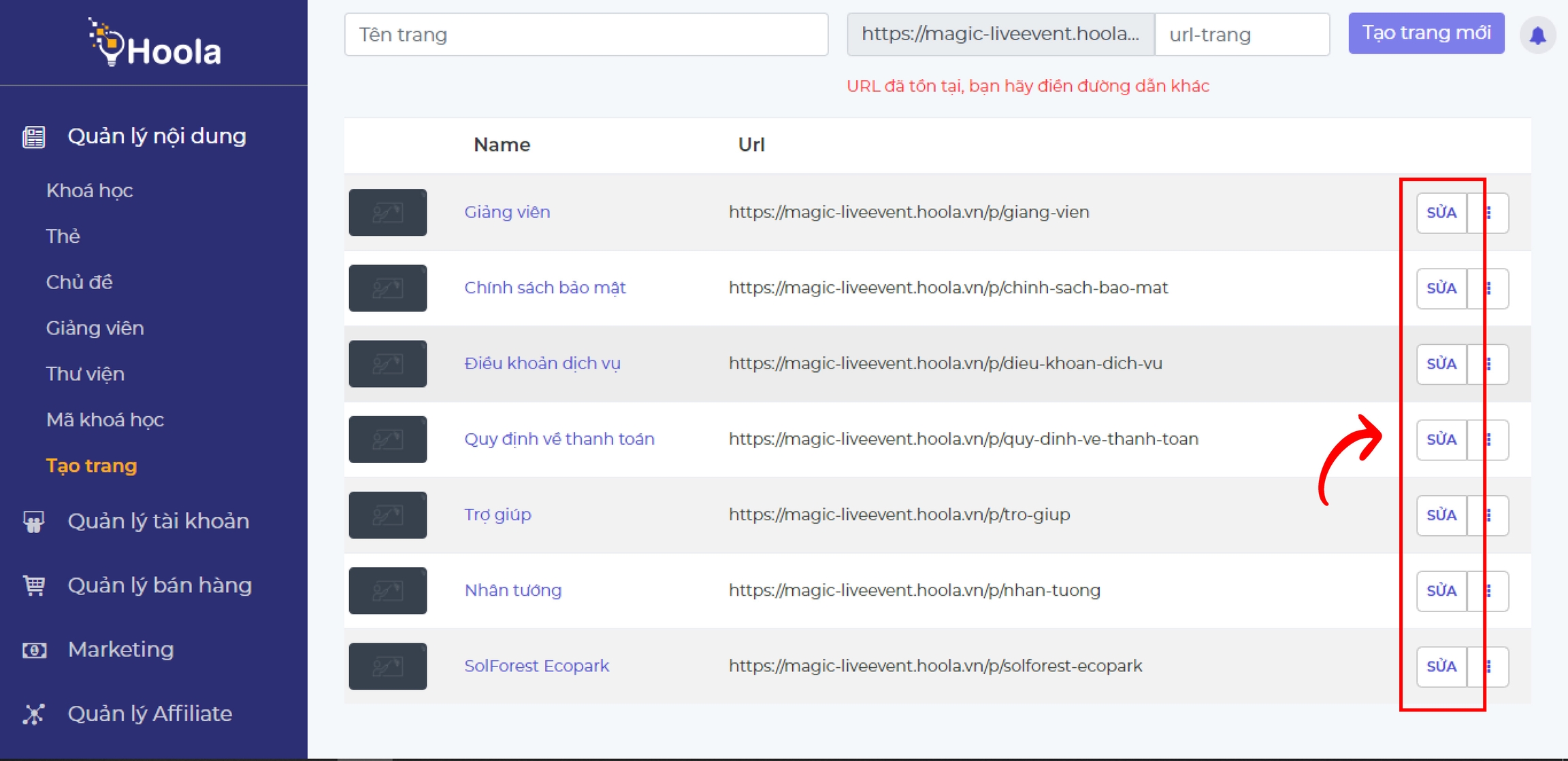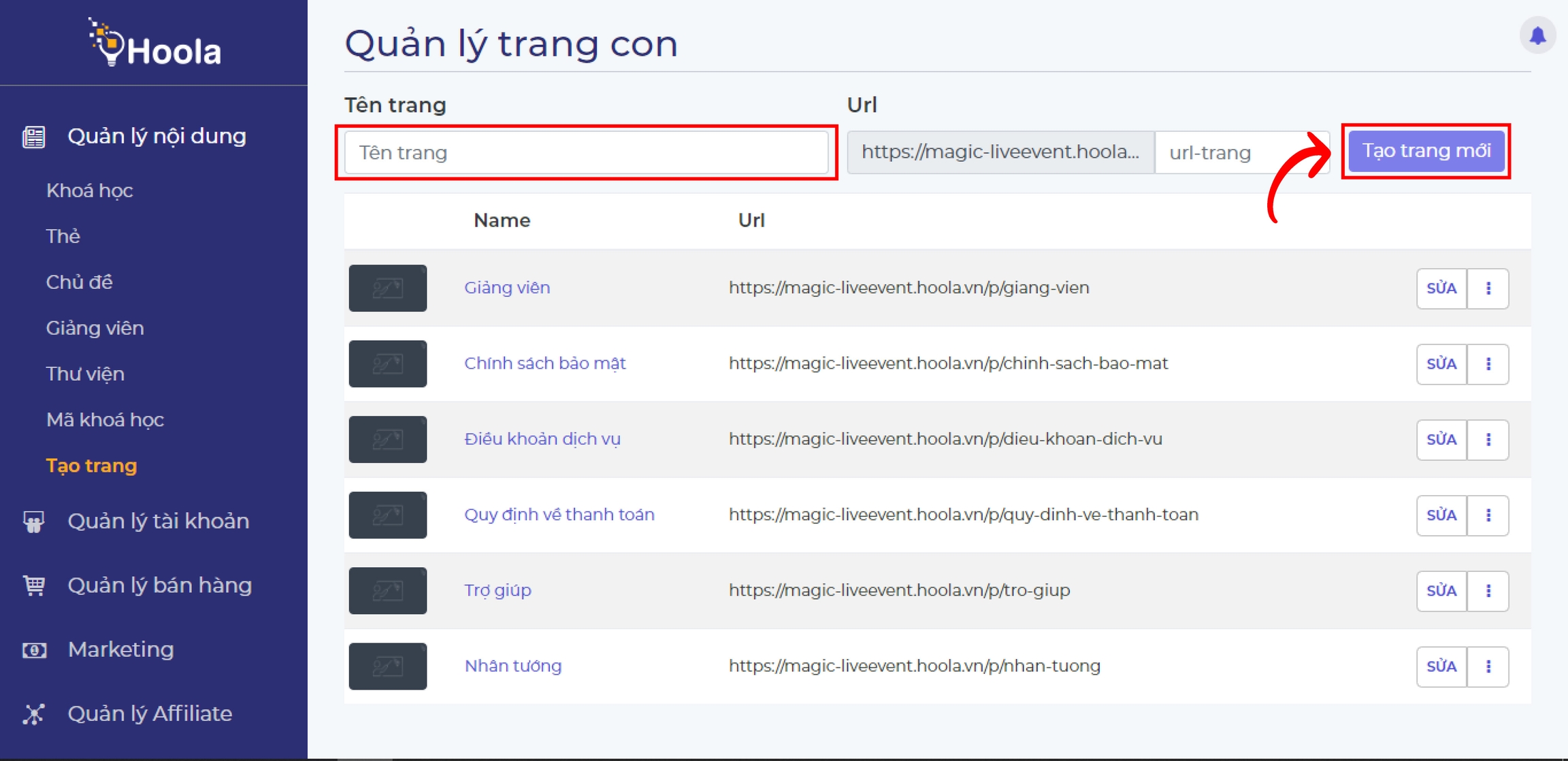 Quản trị viên muốn tạo trang mới, đầu tiên nhập tên trang cần tạo vào ô Tên trang và nhấn Tạo trang mới.