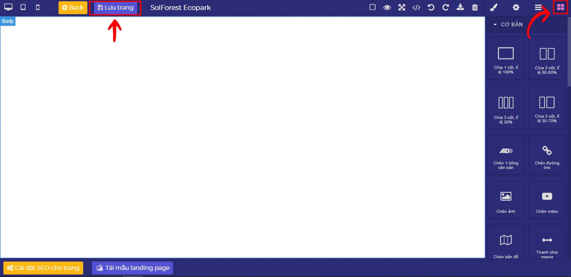 Vùng làm việc sẽ hiện ra, quản trị viên có thể kéo thả tùy chọn các công cụ. Chú ý nên sử dụng công cụ hình 4 ô vuông góc phải phía trên nếu quản trị viên mới sử dụng tới Landing page để dễ dàng thao tác hơn.