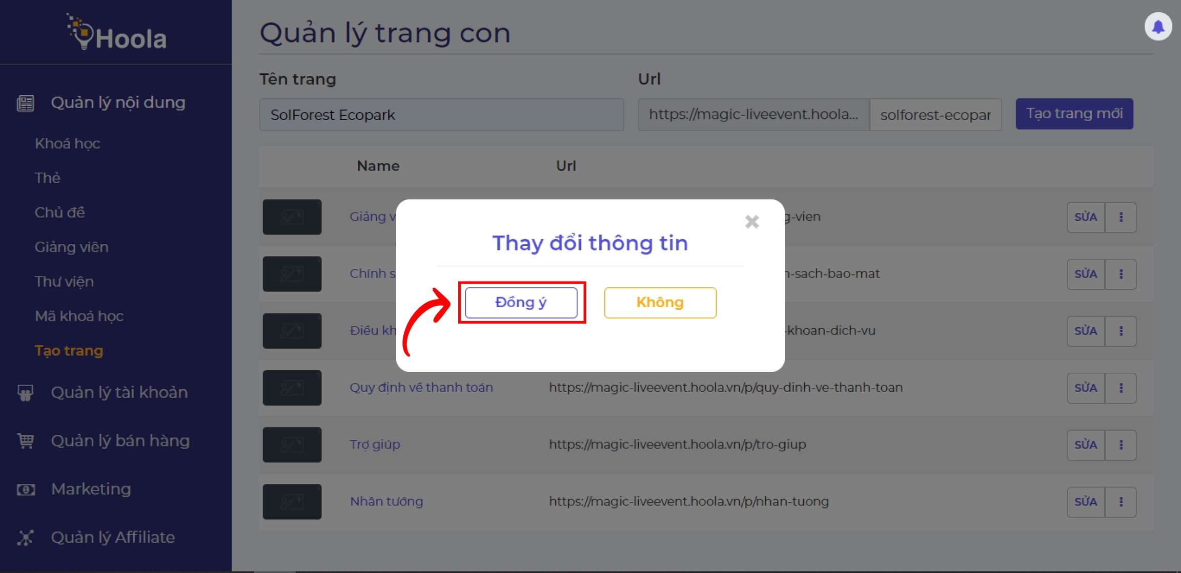 Sau khi điền tên trang xong, màn hình sẽ hiển thị popup, nhấn Đồng ý.