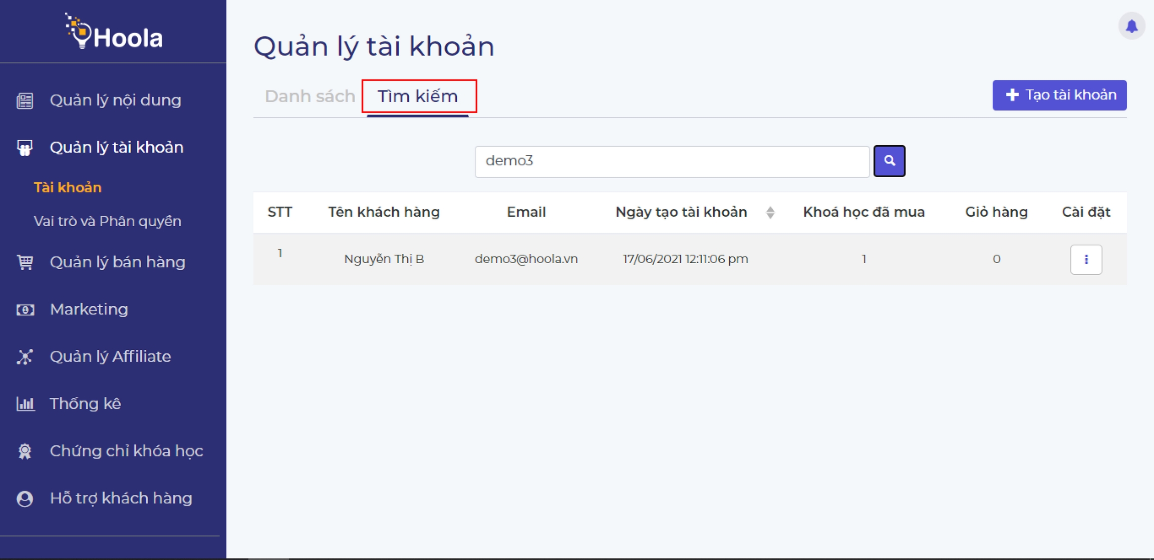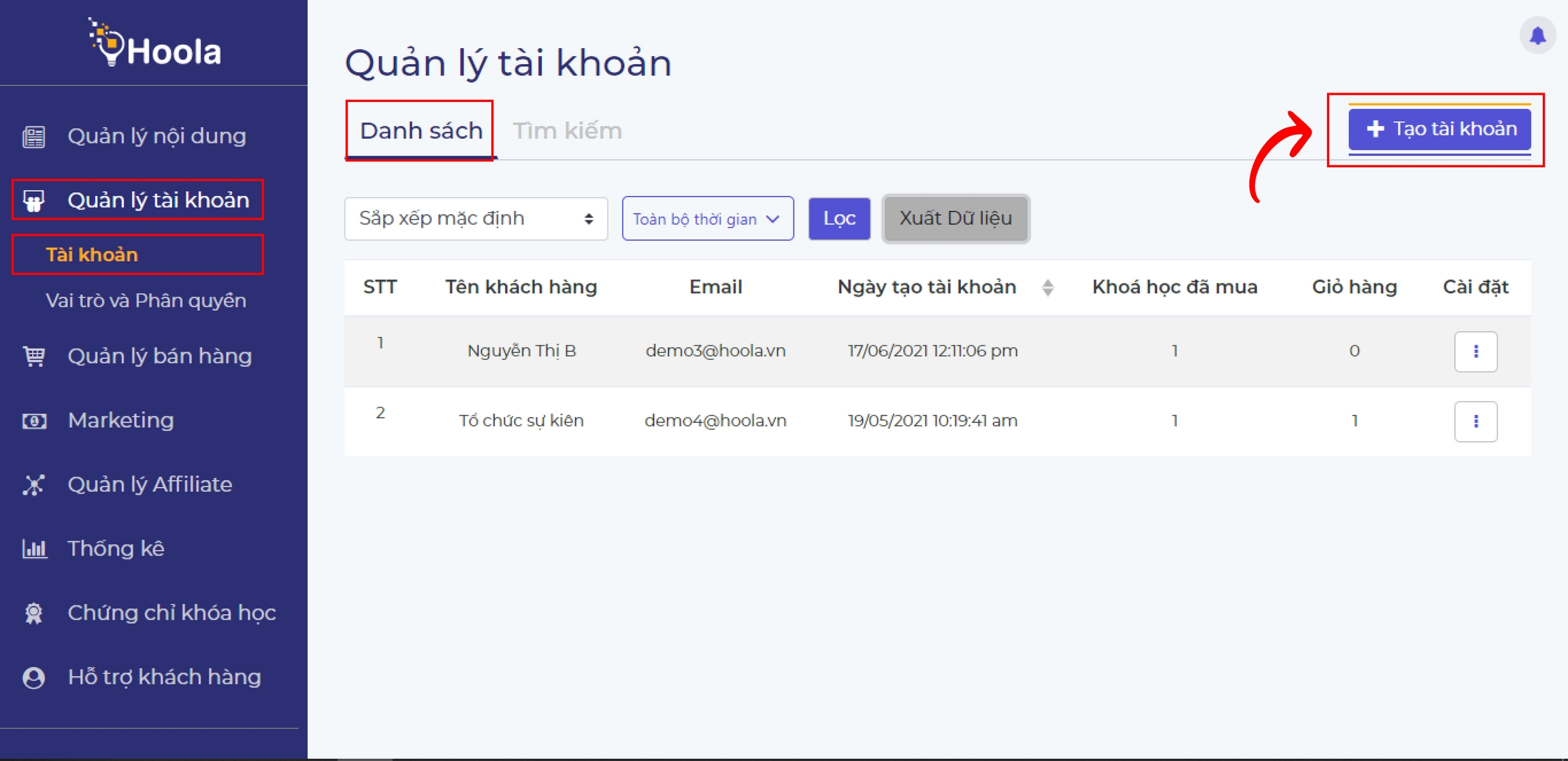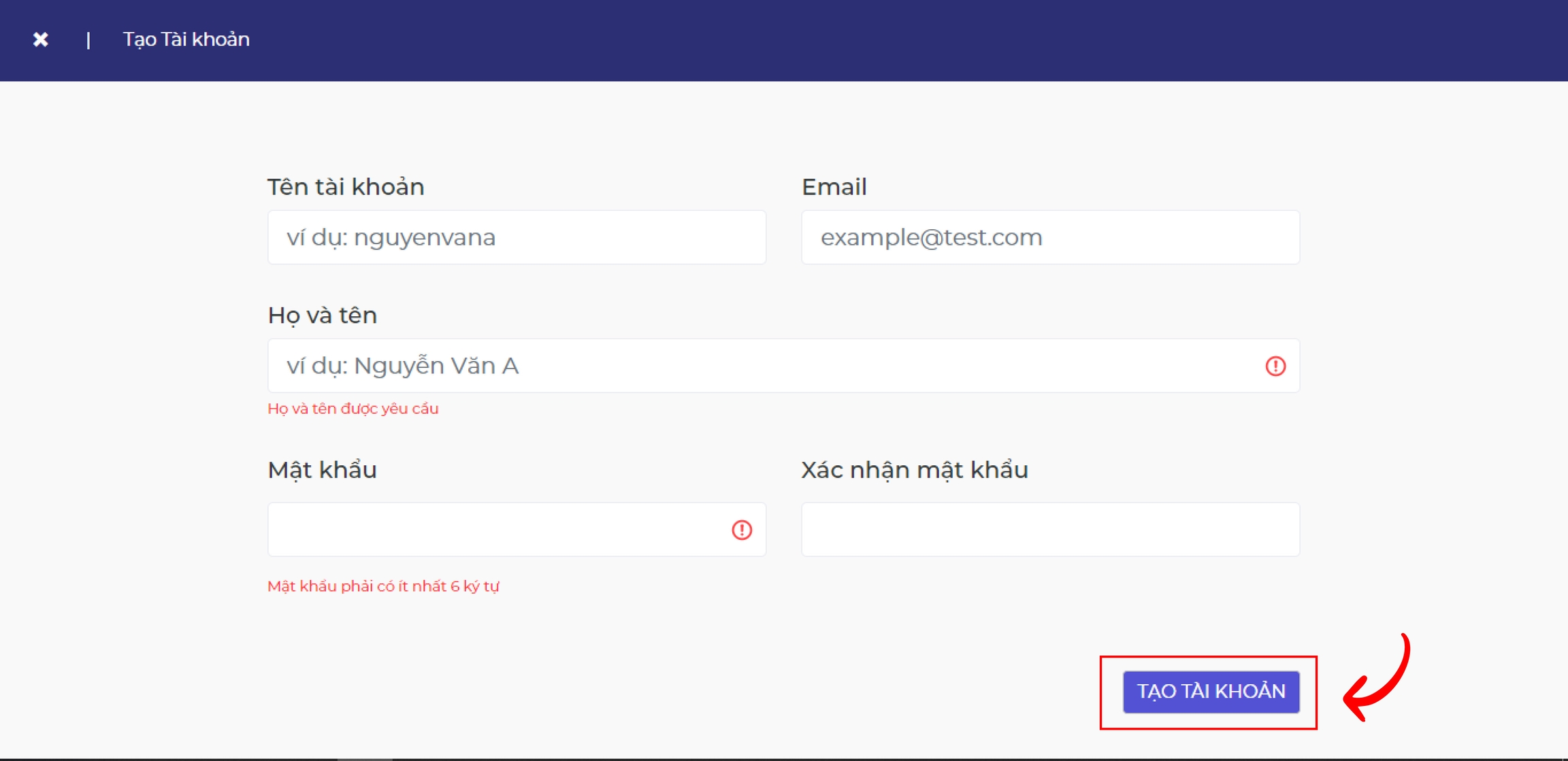 Sau đó điền thông tin của học viên và nhấn Tạo tài khoản.