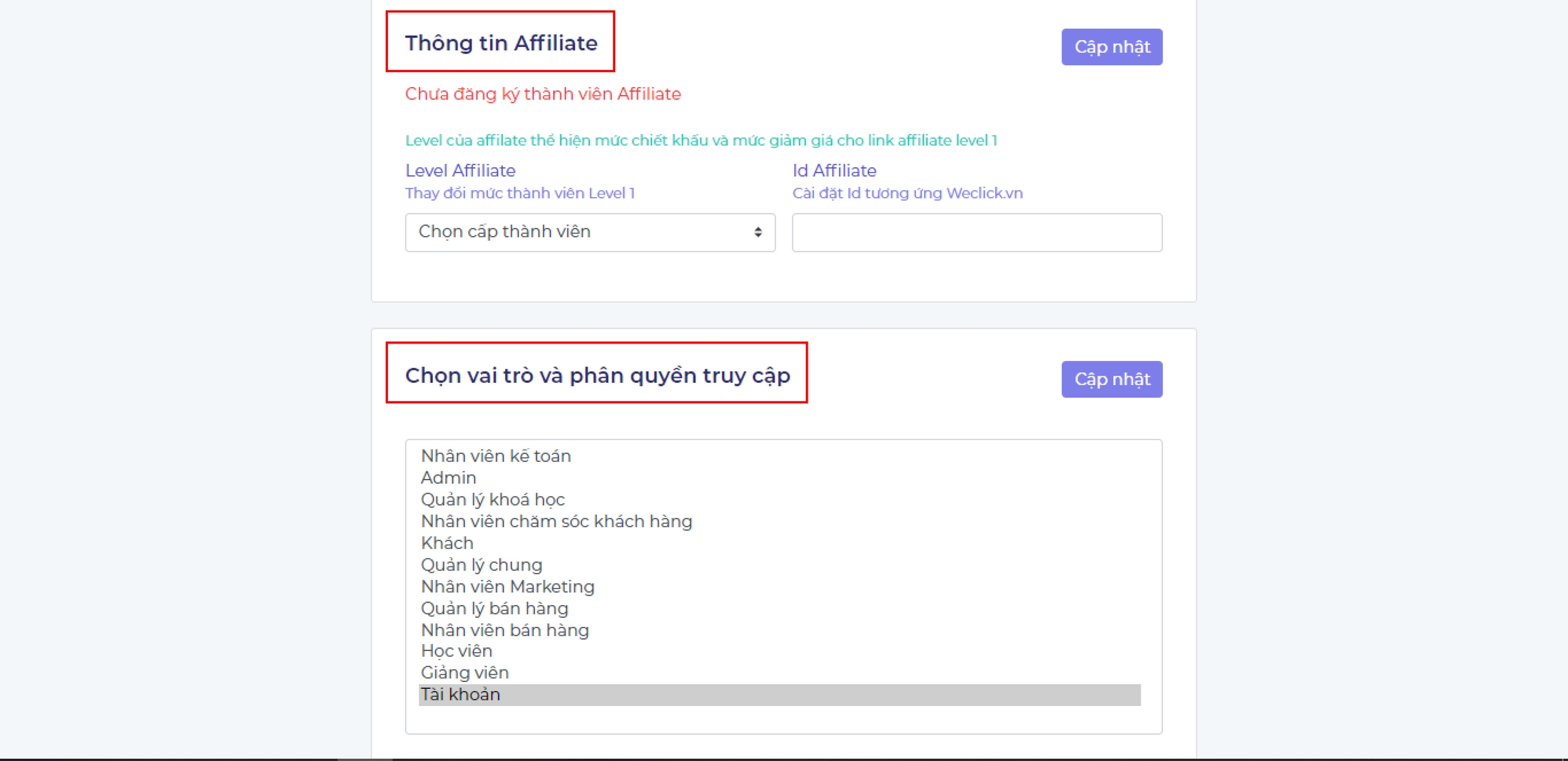 Tại mục Thông tinđầu tiên, có những thông tin chi tiết mà quản trị viên có thể quan sát. Ngoài ra có 2 phần quan trong, Thông tin Affiliate - điều chỉnh mức thưởng cho tài khoản từ mức 1 đến mức 5 tùy chọn khi học viên trở thành cộng tác viên & Chọn vai trò và Phân quyền truy cấp - Phân hạng cho một tài khoản bất kì cho đội nhóm của Web.