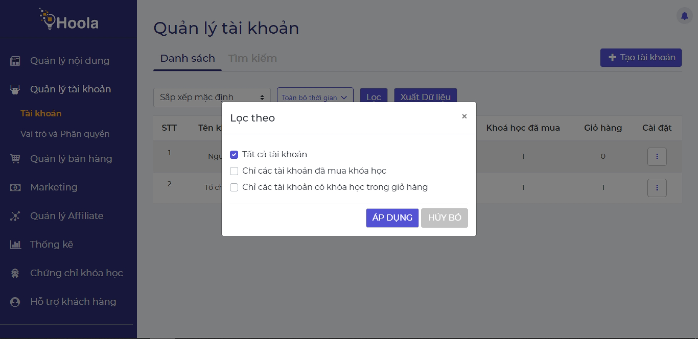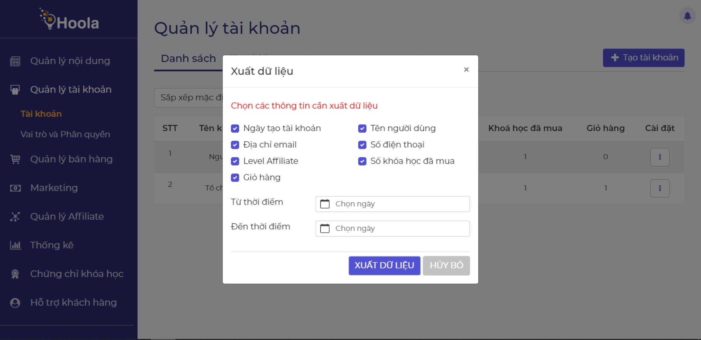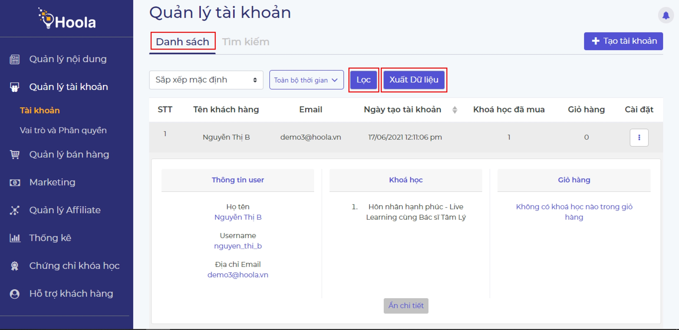 Quay trở lại phần Danh sách, quản trị viên có thể Lọc thông tin hoặc Xuất dữ liệu học viên.