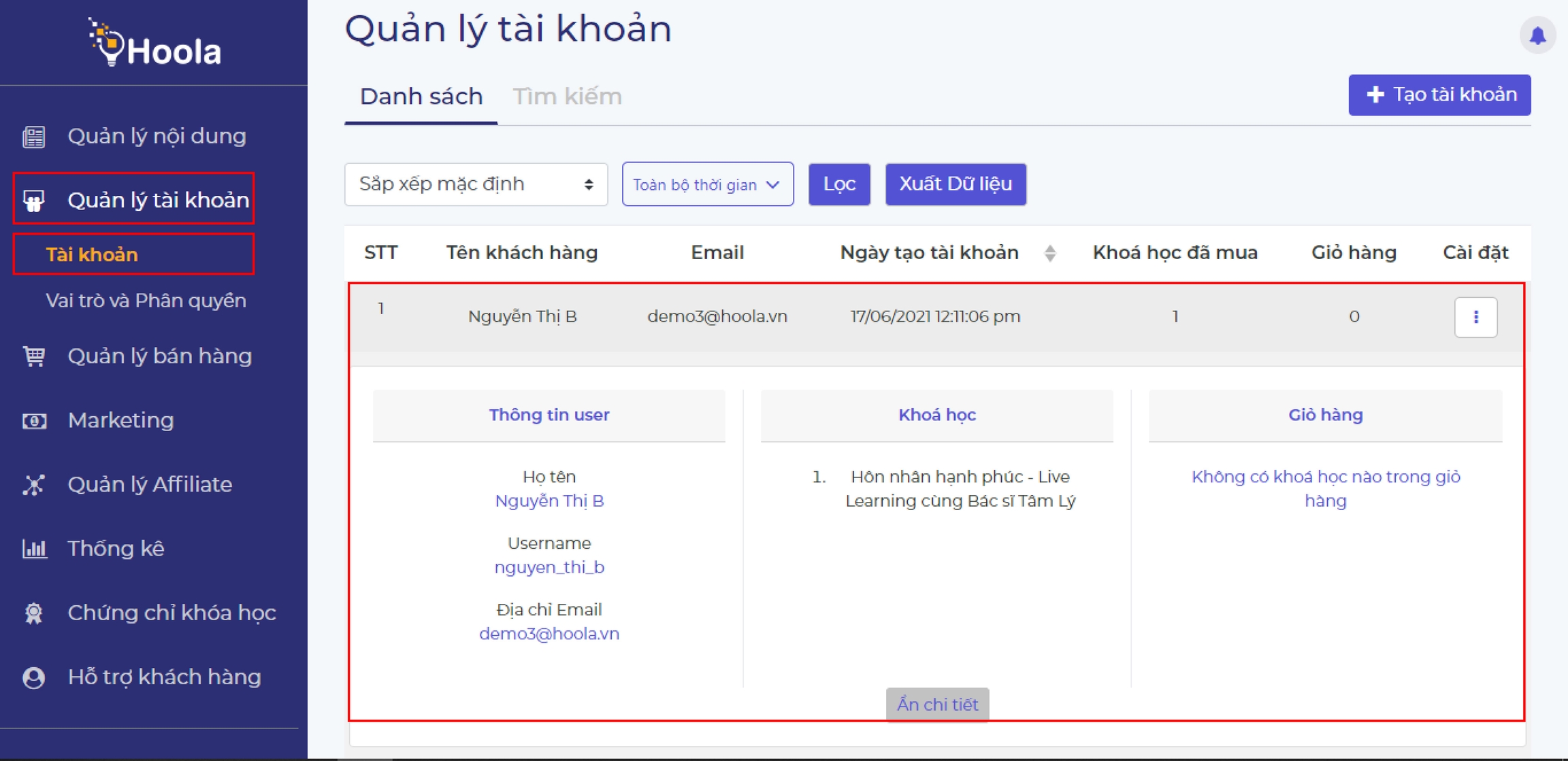 Quản lý tài khoảnTài khoản, chọn một tài khoản bất kỳ mà nhà quản trị muốn xem thông tin, bảng thông tin sẽ mở ra có những trường thông tin quan trọng được hiện thị.