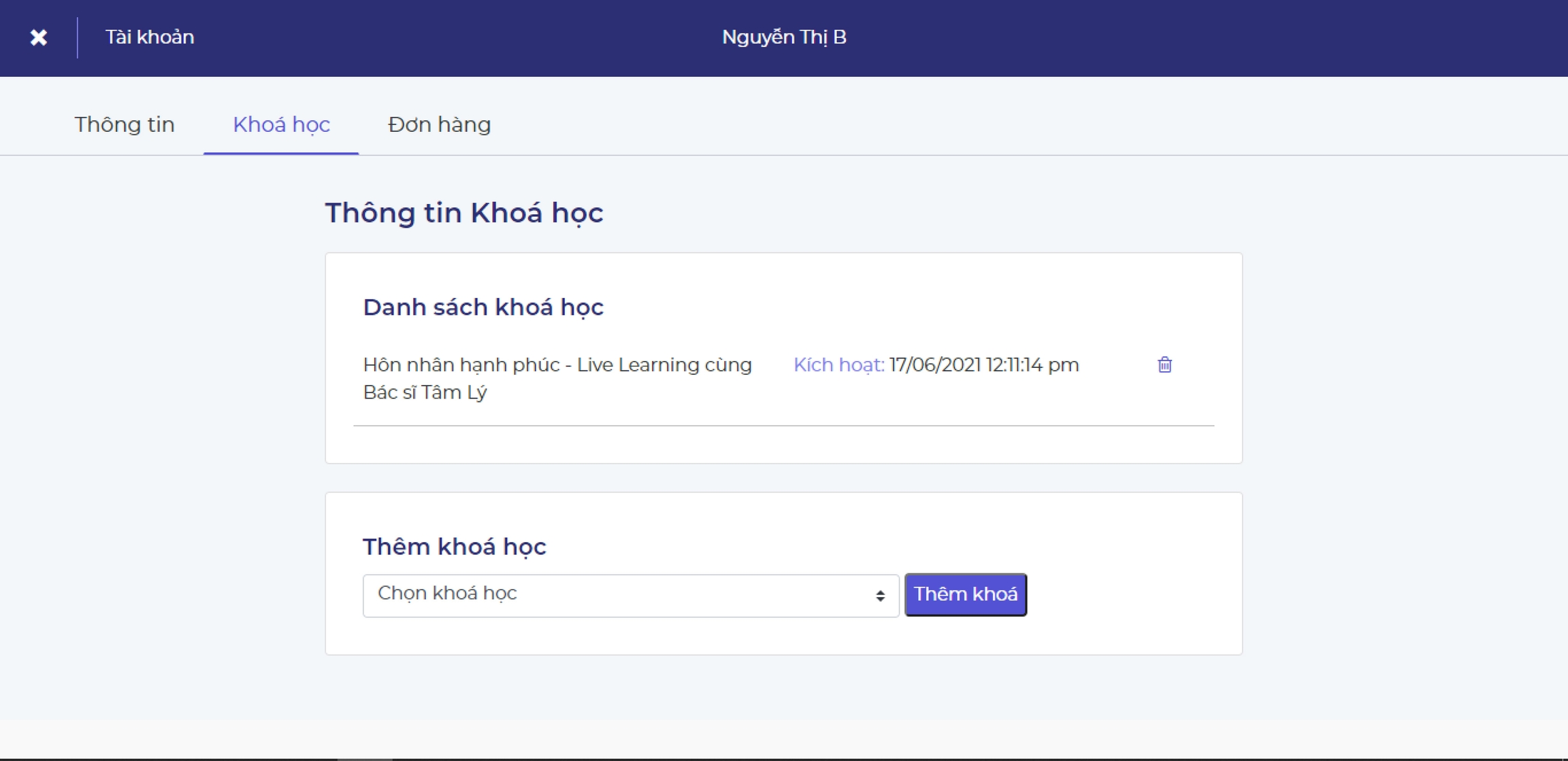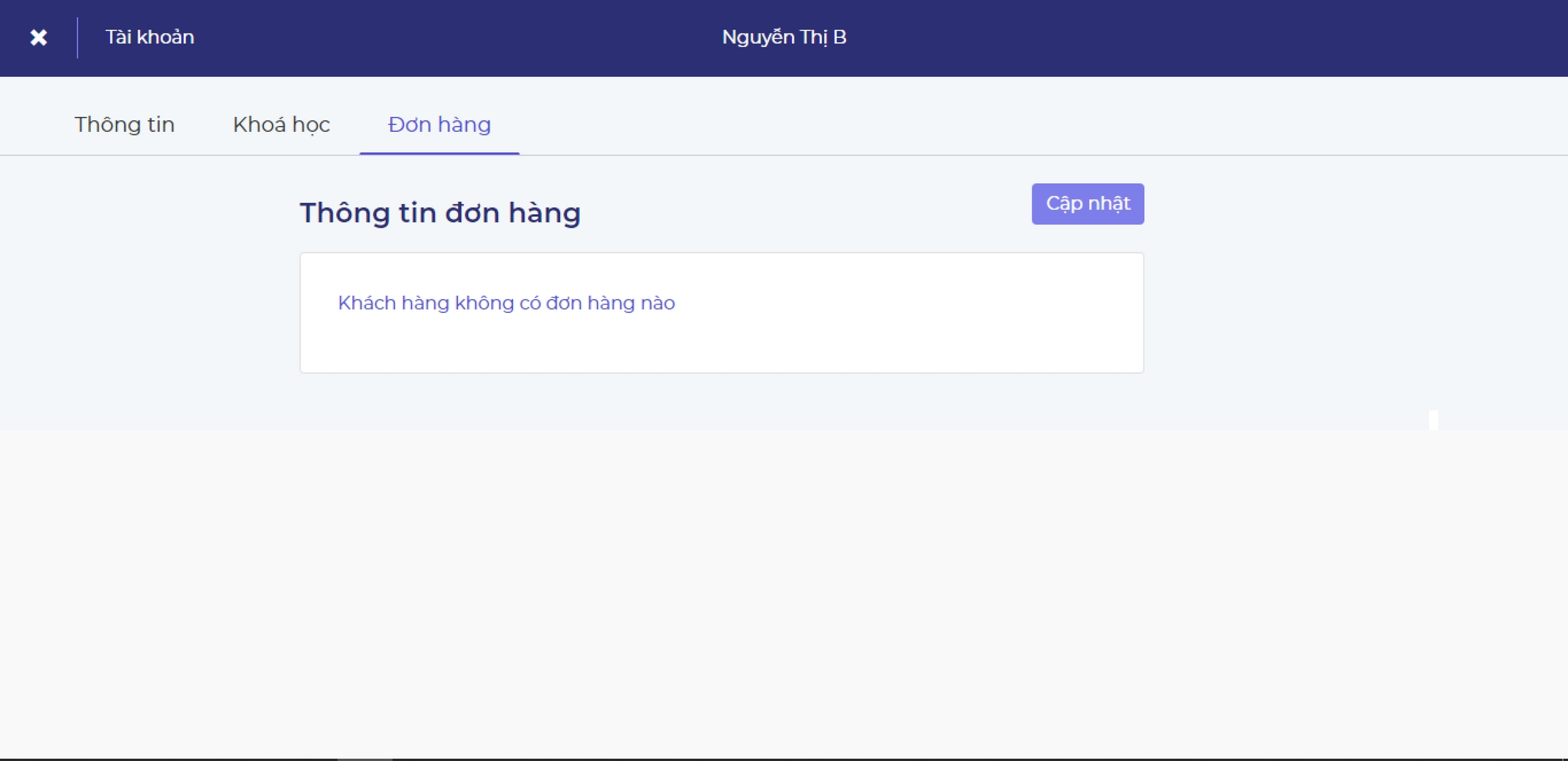 Tại mục Đơn hàng thứ ba, quản trị viên có thể xem các đơn hàng khóa học mà học viên đã tương tác.
