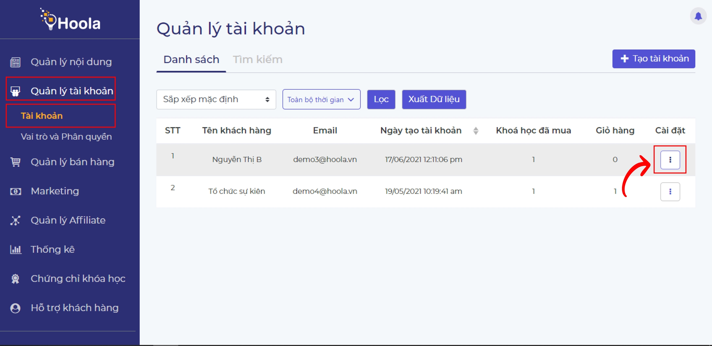 Để chỉnh sửa thông tin chi tiết, quản trị viên nhấn vào dấu 3 chấm cuối dòng của một tài khoản và nhấn